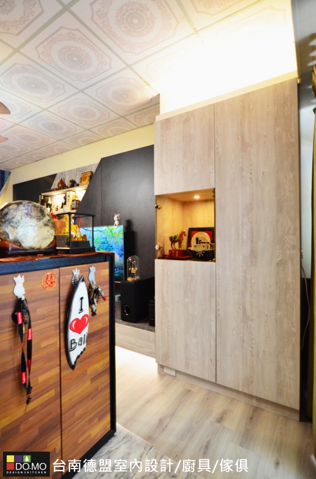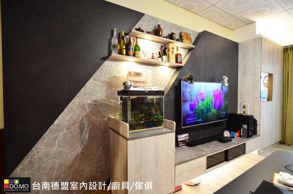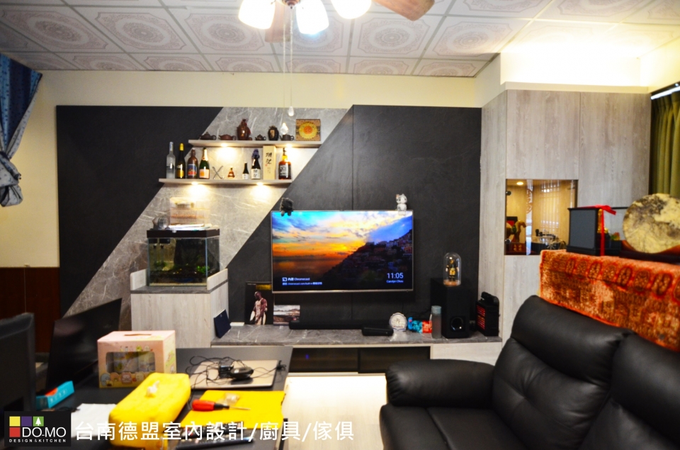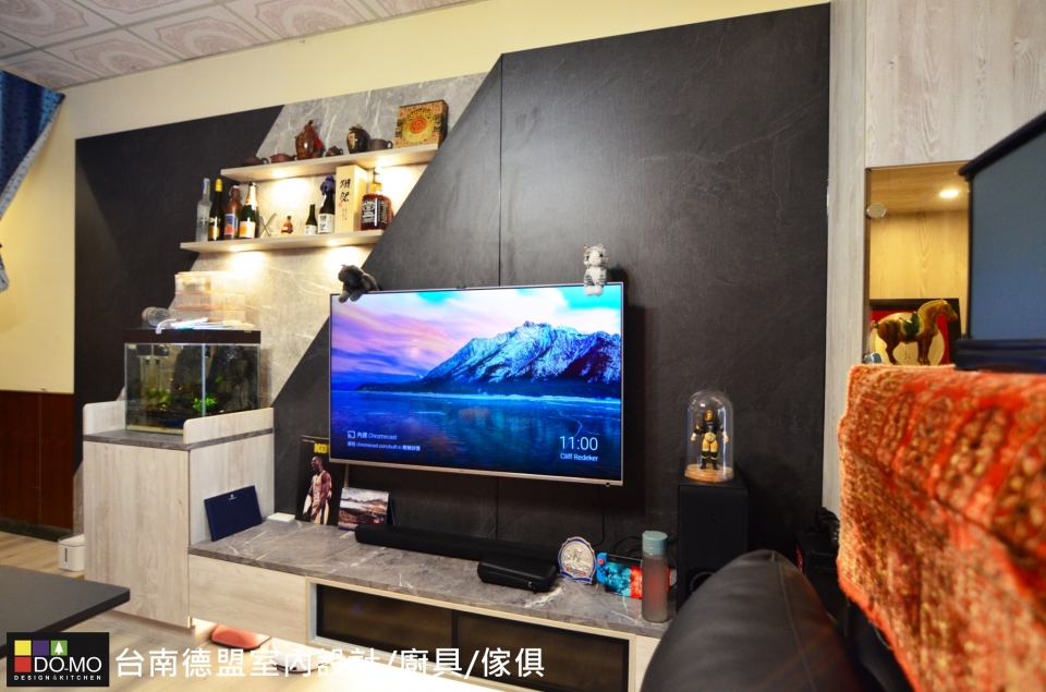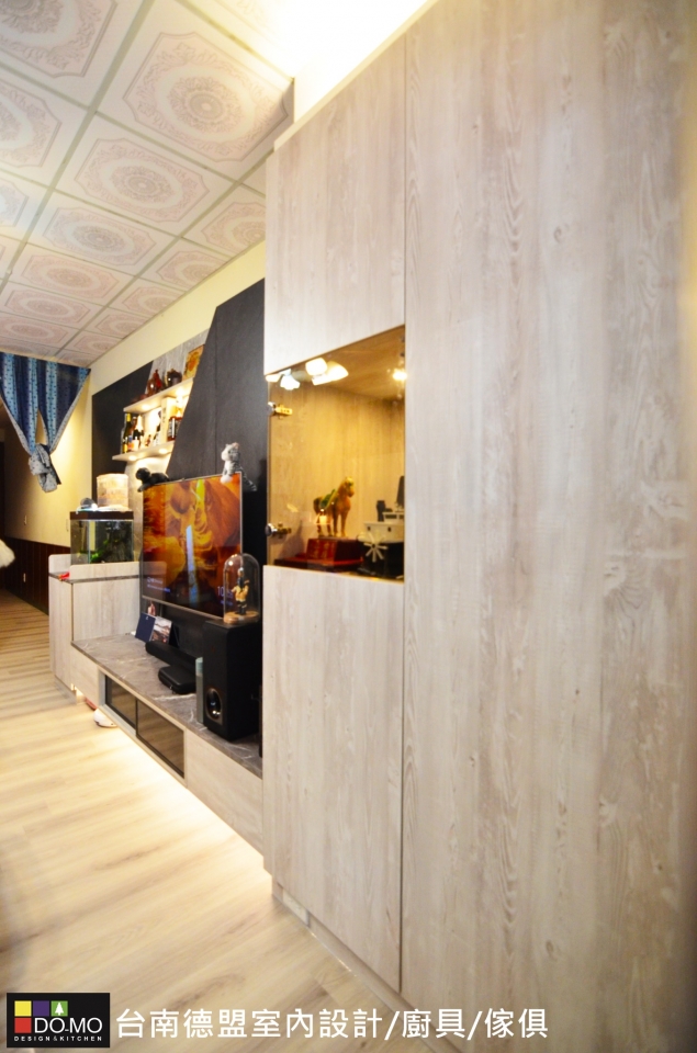 展示家中亮點,營造混搭個性氛圍 座落位置 ⏩台南市北區 施作項目 ⏩系統家具&系統櫥櫃 主要材料 ⏩EGGER-日本F1四星級塑合板/奧地利BLUM緩衝後鈕 利用撞色的板材拼接出電視背牆,創造視覺層次,並整合收納與展示機能,豐富了整體特色,也增添了不少儲物空間。