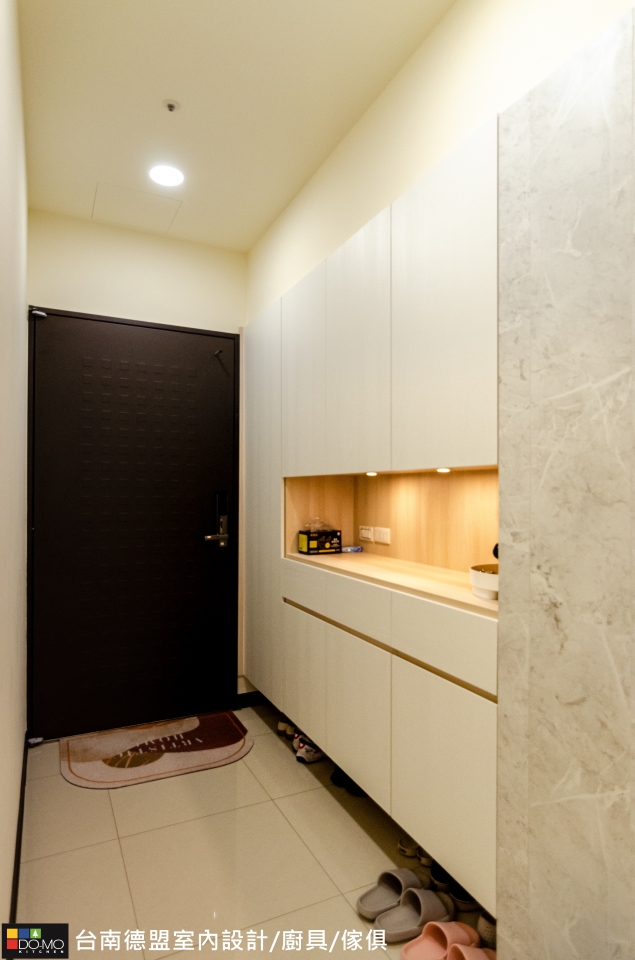 以純白色為主調,鞋櫃下方做懸空設計,方便居住者放置拖鞋或常穿的鞋子,並營造輕盈感。