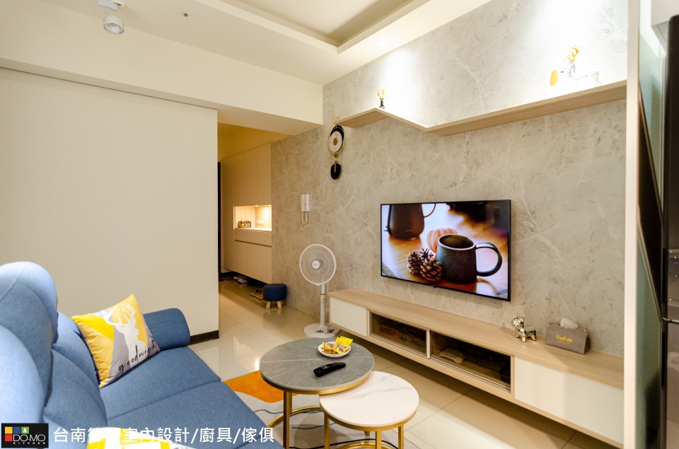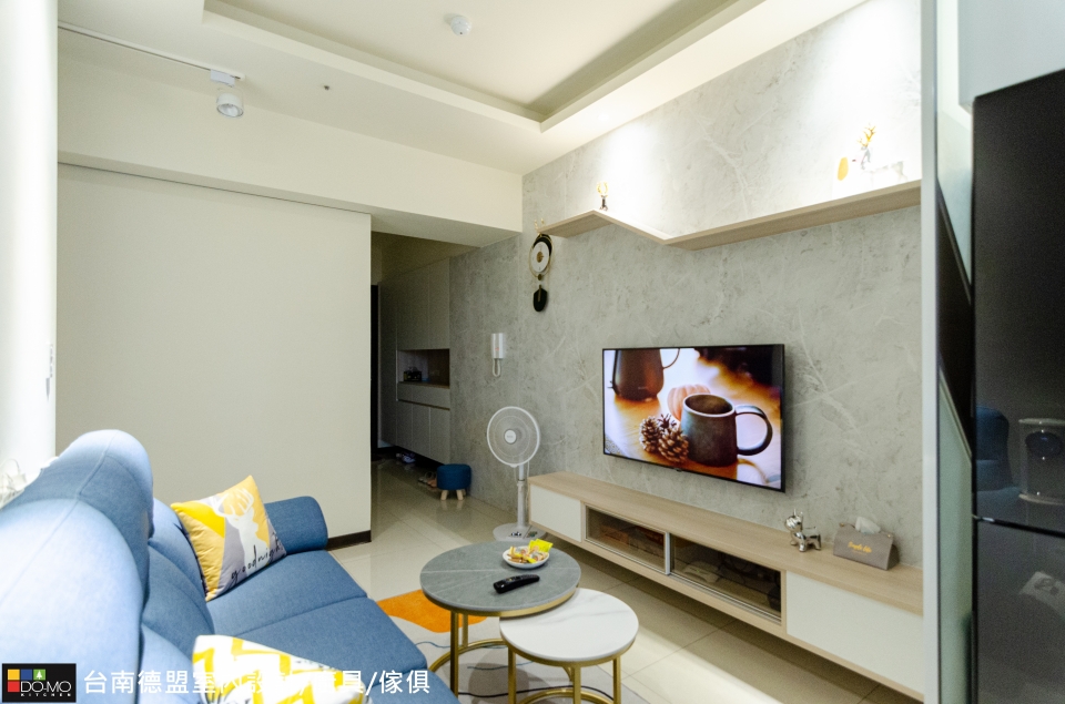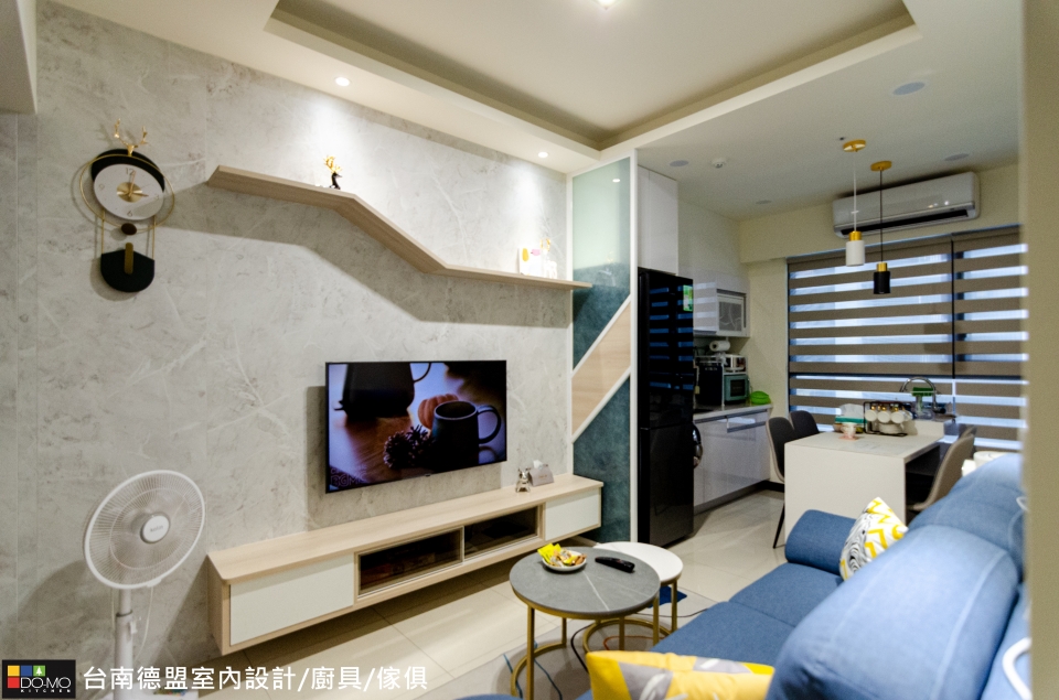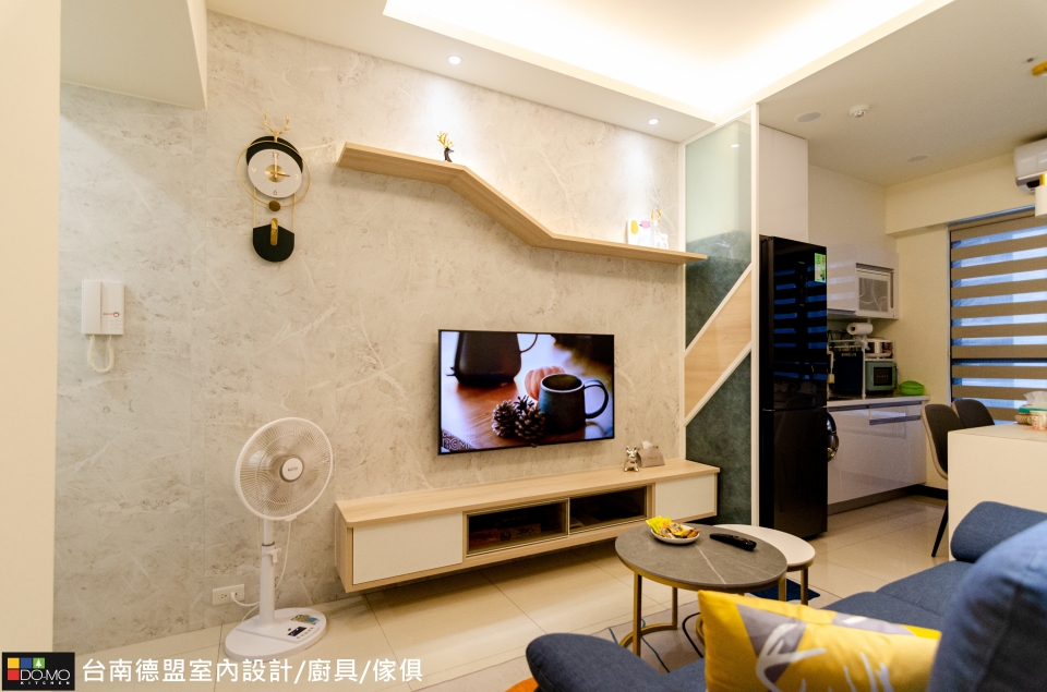 來到客廳,電視牆以淺灰揉和特殊紋路,並規劃簡約的電視櫃和展示層架,展現俐落生活樣貌;廚房空間將中島結合餐桌功能,開放式的設計更能增添家人間的互動。
