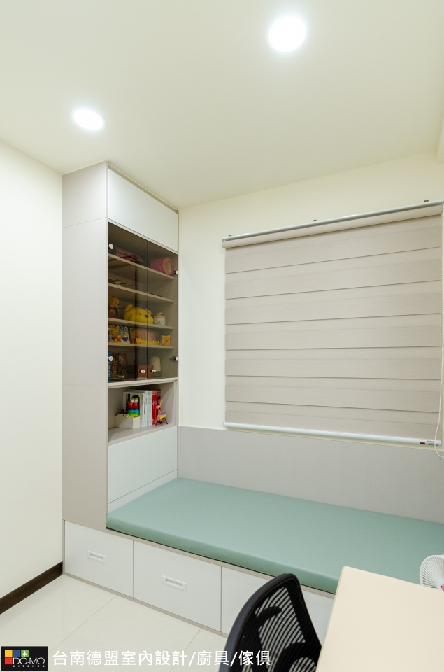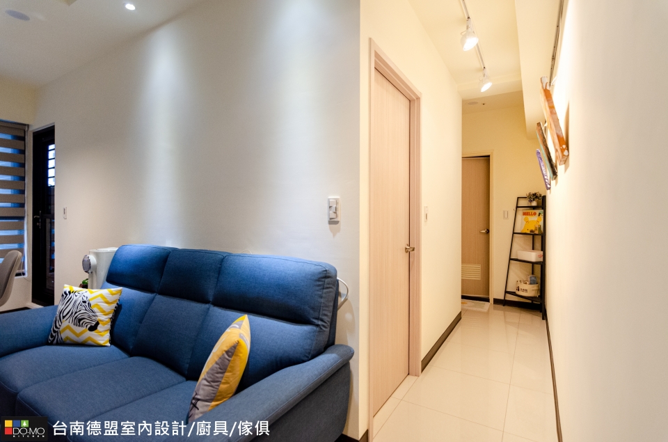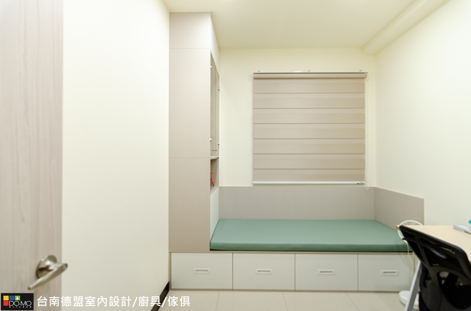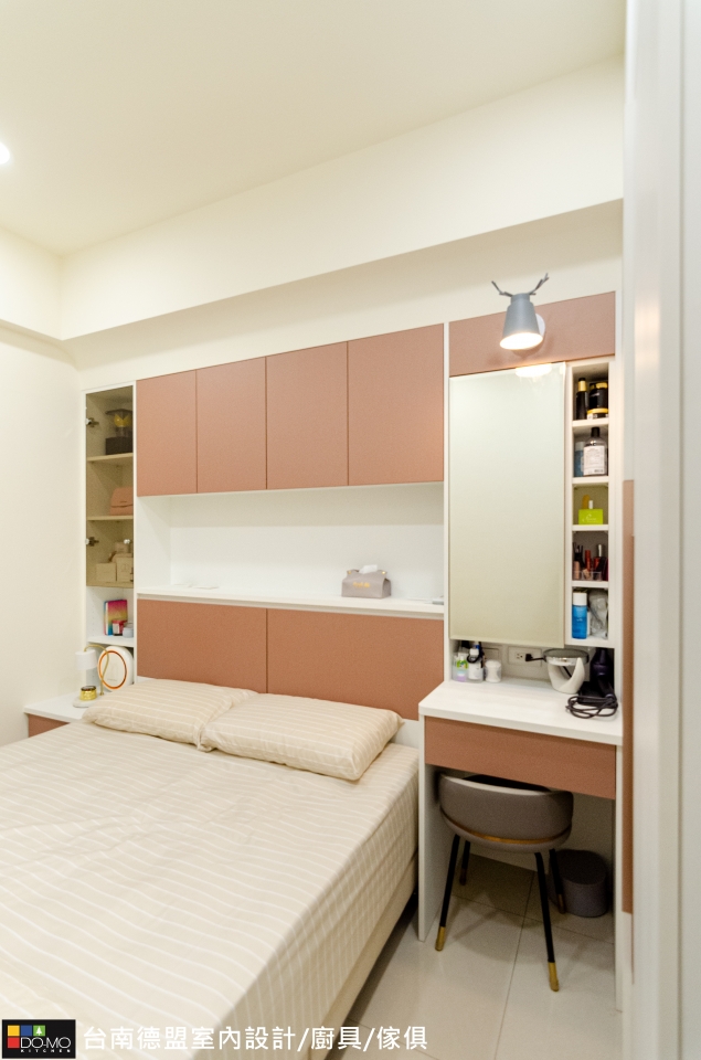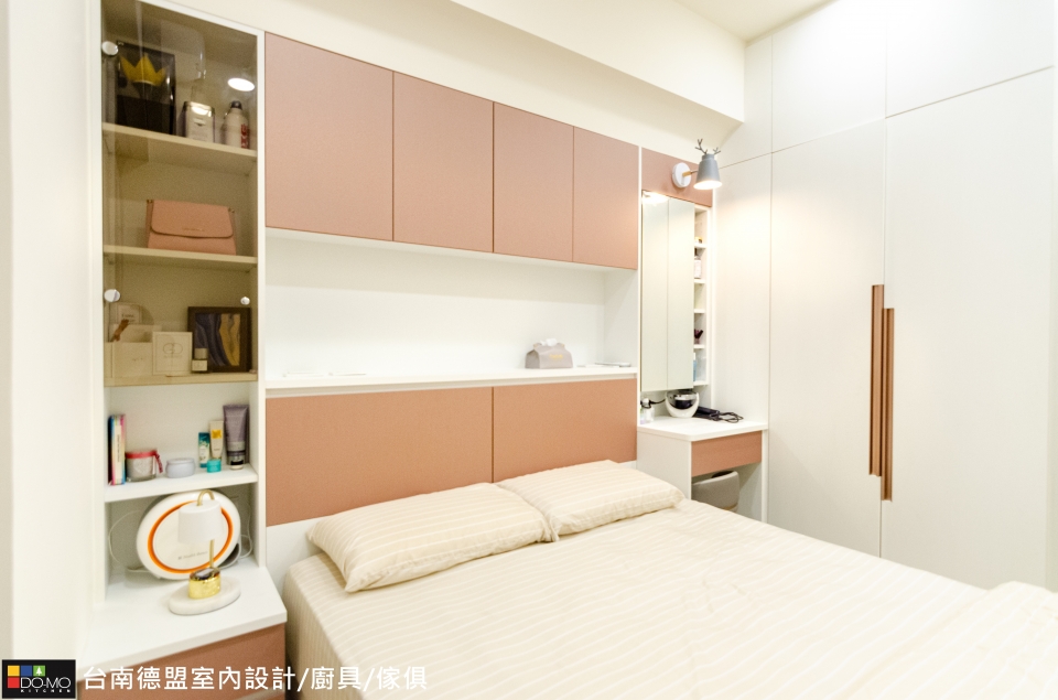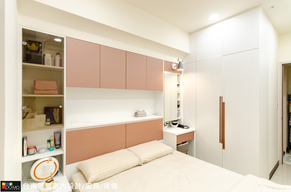 臥室延續公領域以純白做為基底,搭配溫和的色彩,減少繁複裝飾,增加充足的收納機能,打造簡單但不單調的實用空間。