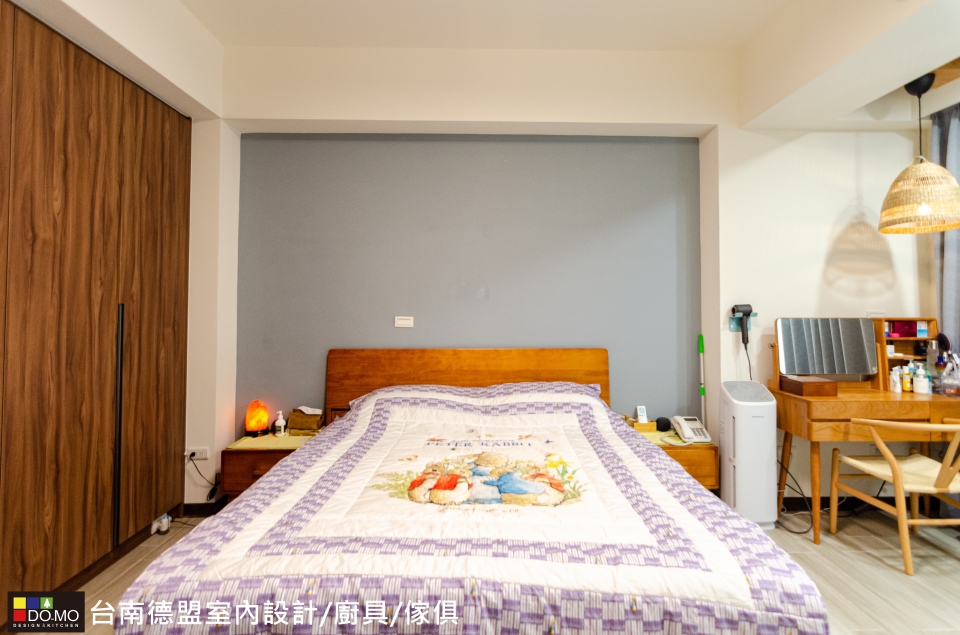 透過材質與色調打造明亮的現代生活氛圍 座落位置 ⏩台南市安定區 施作項目 ⏩室內設計&系統廚具&系統家具&臥室衣櫃 主要材料 ⏩EGGER-日本F1四星級塑合板/日本儷仕矽酸鈣板/奧地利BLUM緩衝後鈕 主臥以簡約的木質與藍灰色的搭配揉和出溫潤的氛圍,次臥也延續同樣風格並設置充裕的收納擺放空間,滿足機能需求。
