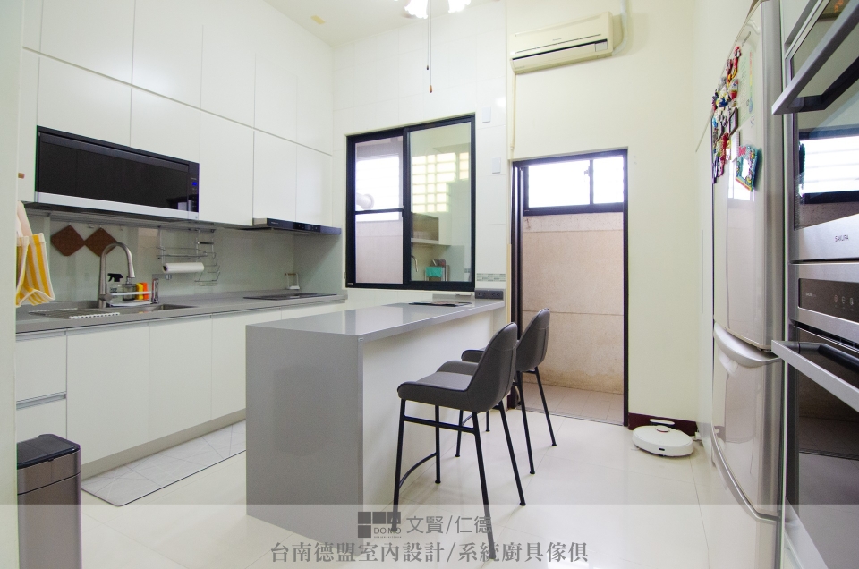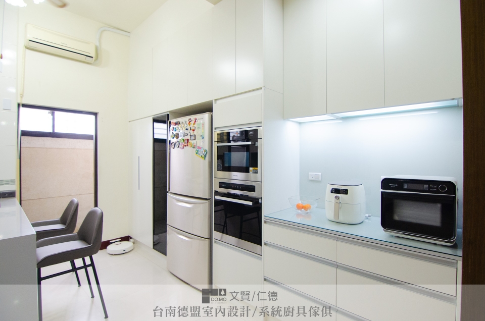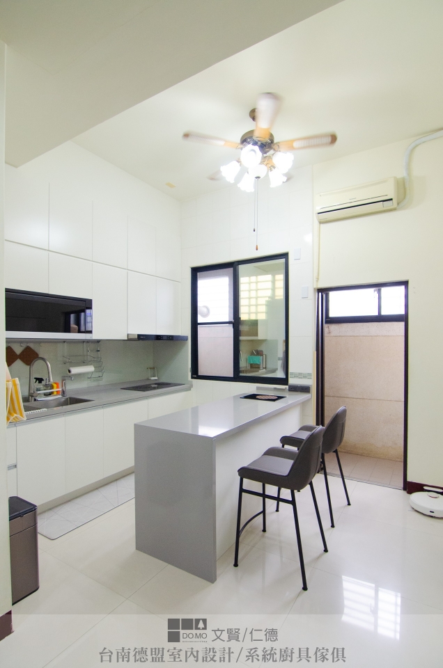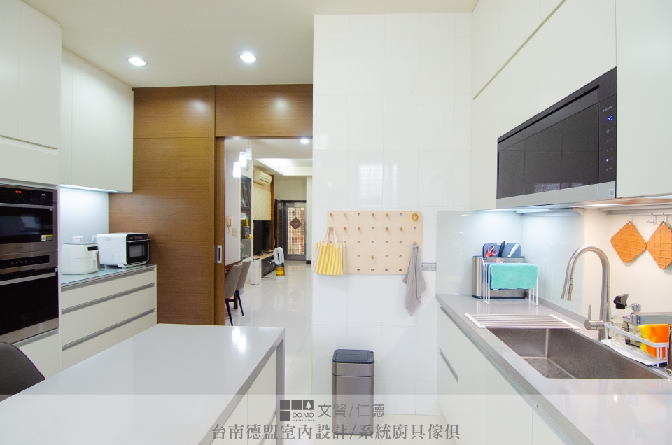 礙於格局關係,廚房是切成空間裡『前、中、後、』的規格,分別是料理區、中島區、收納區。