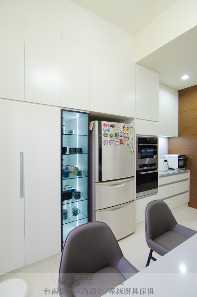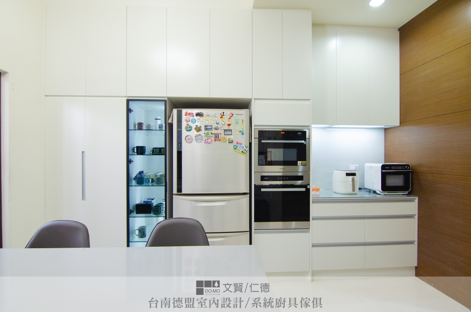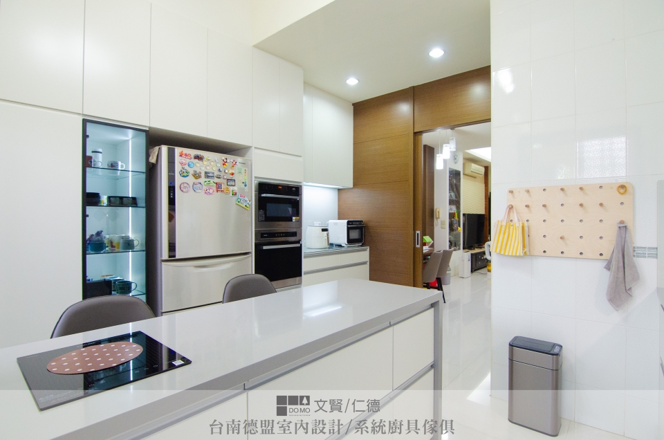 新增設的中島為業主彌補了料理區較為窄小,備菜空間不足的缺陷;而占據整面牆的多功能收納櫃則大大滿足了業主的收納需求。不僅是一般收納櫃,設計師為業主規劃了雜物、電器、展示櫃,甚至可置入直立式吸塵器,機能性滿滿!