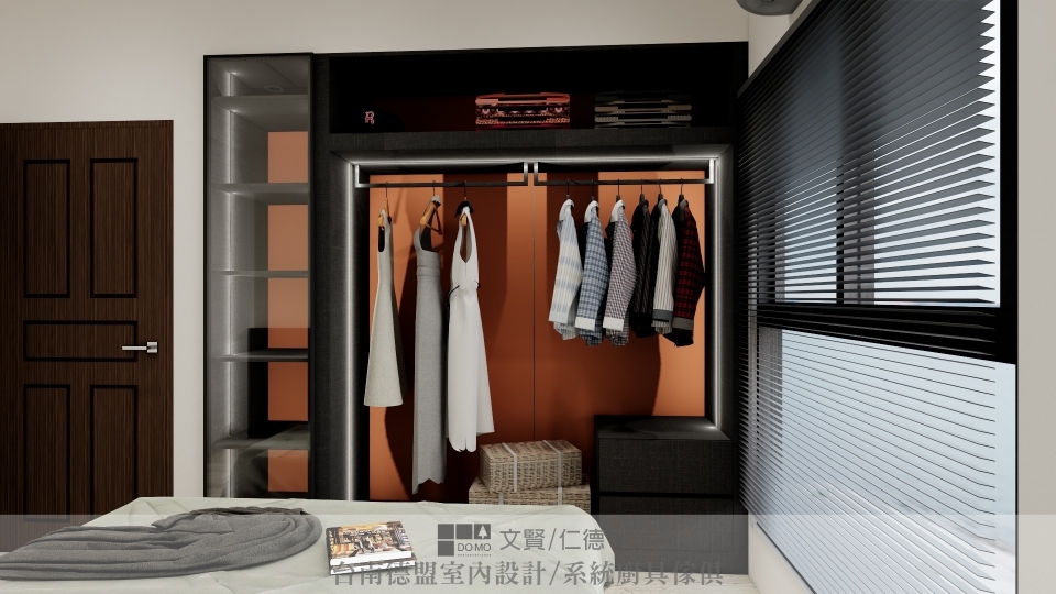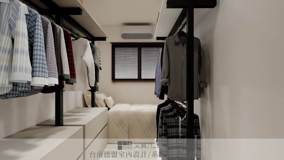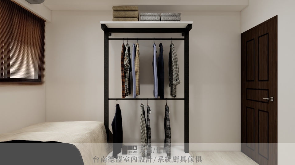 兩間臥室皆選擇開放式衣櫃,在空間較為不足的情況下選擇開放式衣櫃,有助於提高空間延伸感,減輕了一定的重量,一目了然的設計也比一般封閉式衣櫃更加方便取用衣物。