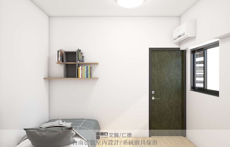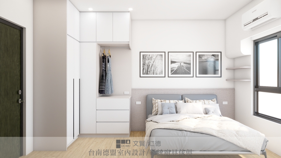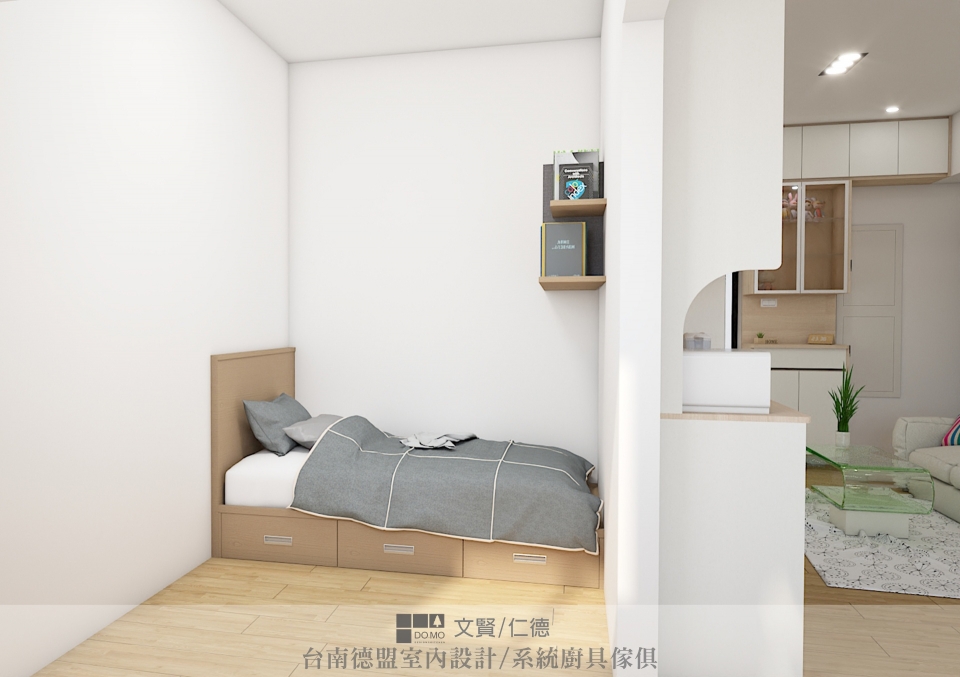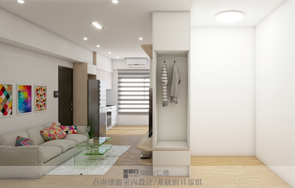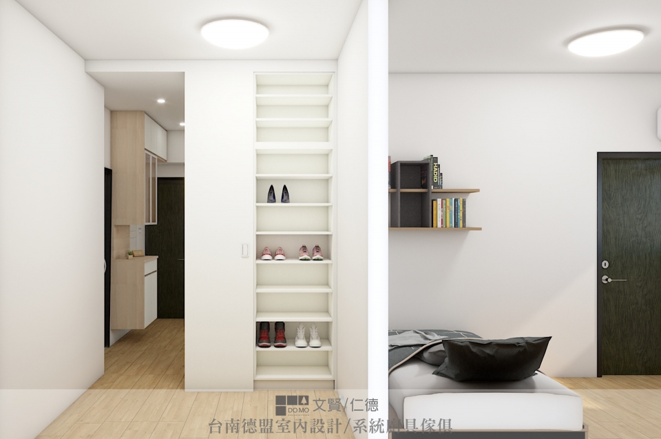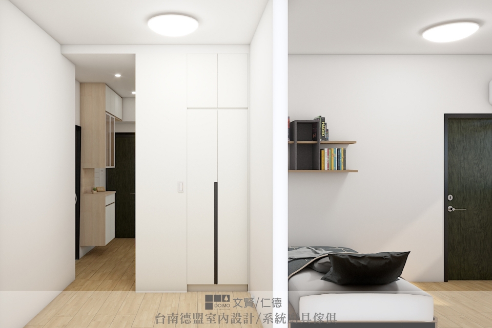 全屋以經典的日系無印配色:白x木紋色作為風格主調,精緻的格局置入適宜的櫃體尺寸,令人遺憾的畸零面積、被硬體遮擋的牆面,皆可用客製化的系統櫃化解問題。