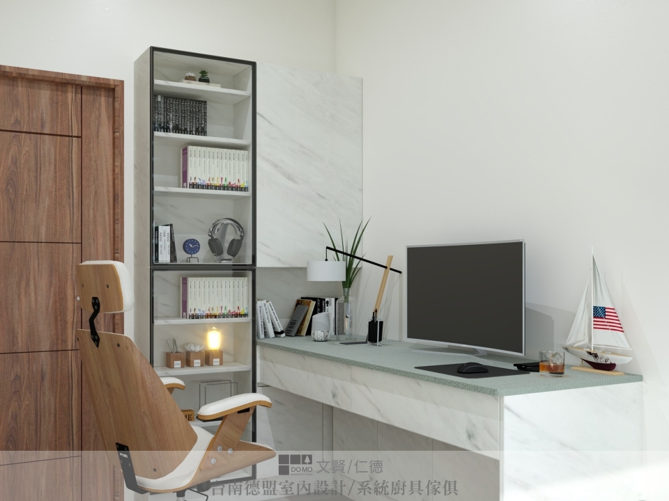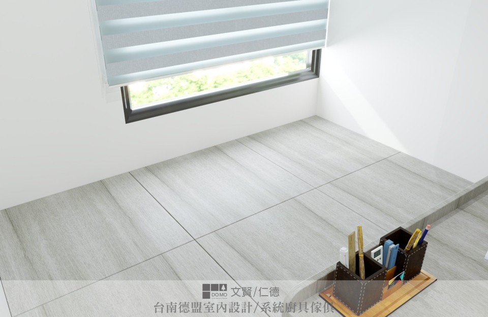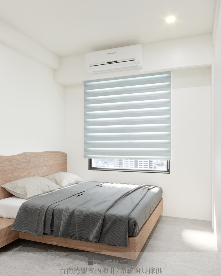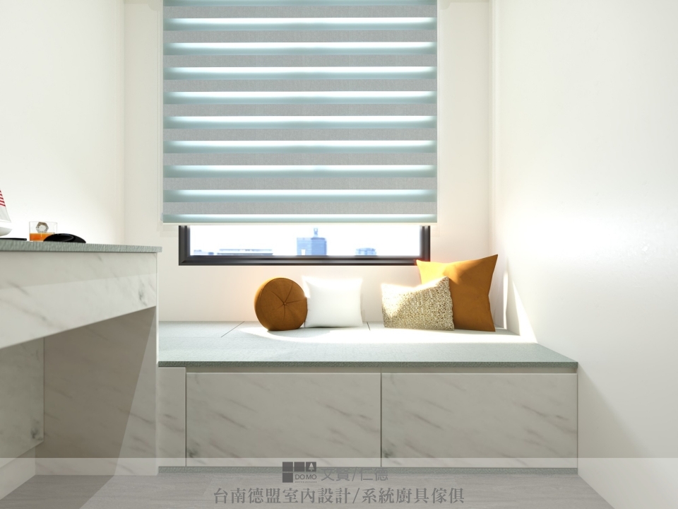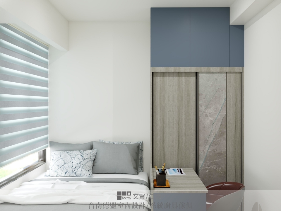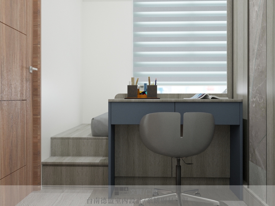 特別的是,兩間次臥的空間較小,但臥室主人均有置入書桌的需求,為了解決收納問題,設計師將臥床區打造成架高後可向下收納的臥榻,這樣的臥榻在使用上就更為彈性了,可因應需求而有不同的變化。