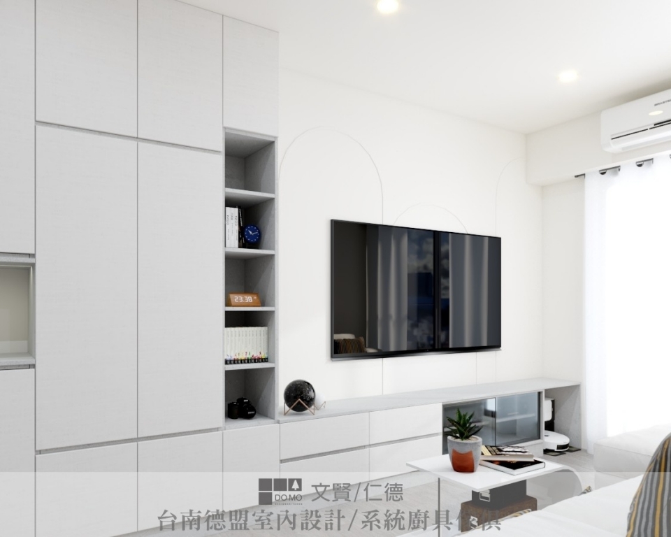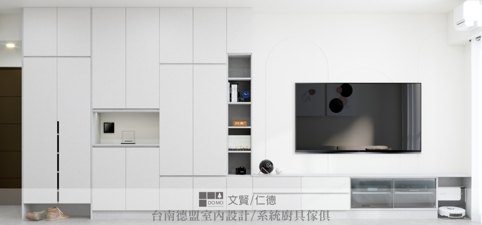 在公領域中,放眼望去皆是一片潔淨純白,白色櫃體、白色牆面、白色家具,是極簡又俐落的風格,再搭配電視牆面簡單的圓弧線條模糊了界線,增添了一點和緩的圓潤感。