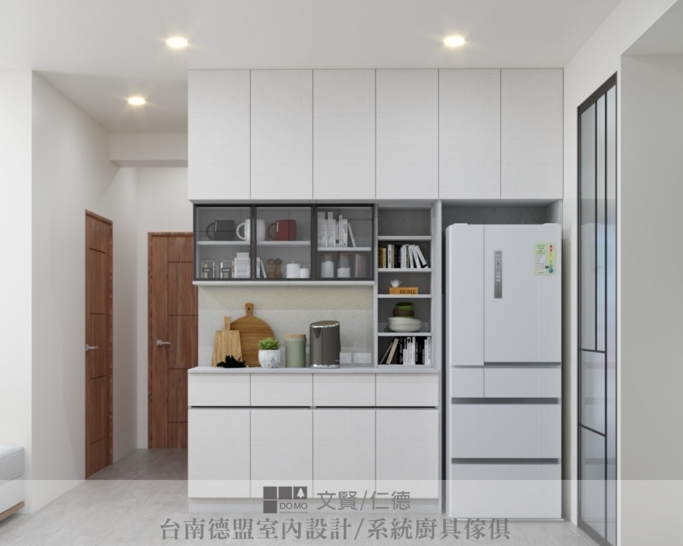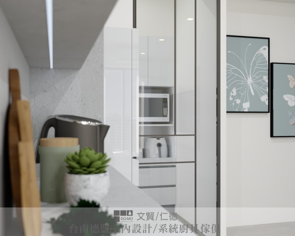 現在的格局規劃一般都是開放式廚房,未免中式料理的油煙影響客廳,依據業主需求,設計師將客廳與廚房獨立開來,增設一道隔間牆以及玻璃拉門,並增加了可收入冰箱的餐邊櫃,替原先收納空間不太足夠的廚房解決了問題。