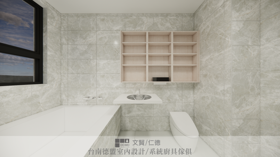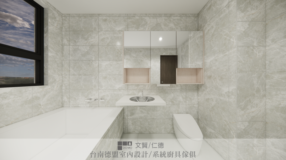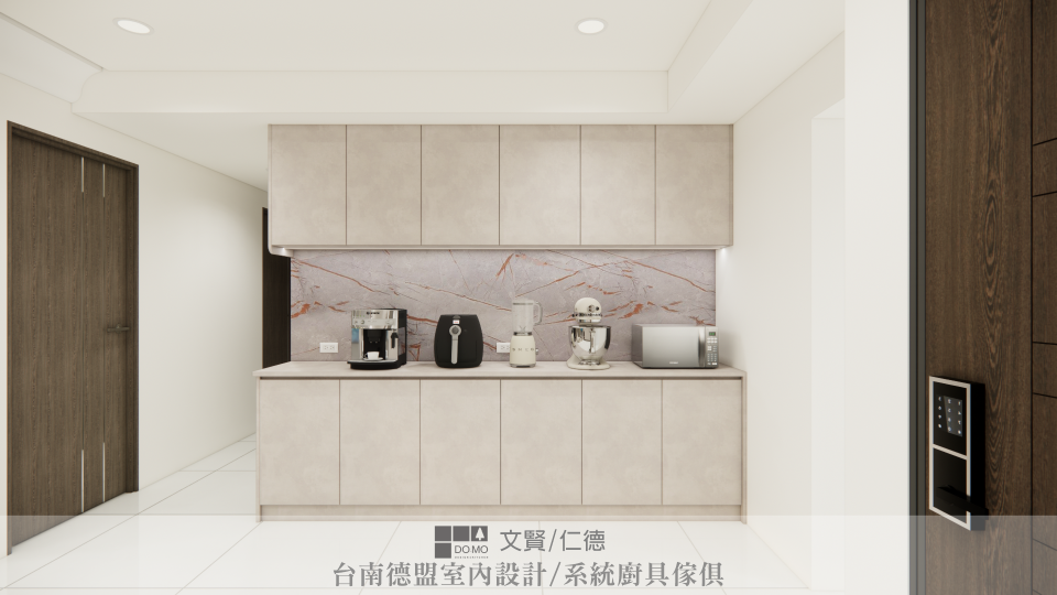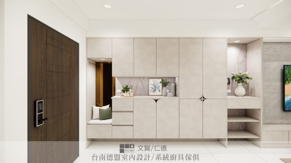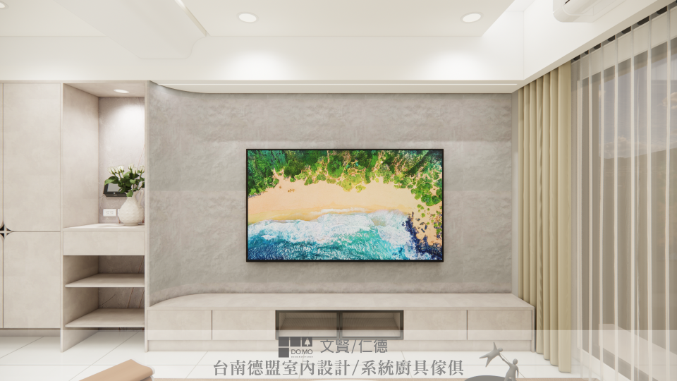 此案同是位於歸仁區的佳展大展,輕柔帶灰調的羊絨灰色替公領域注入優雅溫柔的氣息,局部跳色拼接石紋花樣與電視牆的司曼特漆牆,不同紋理質感因相同色系而達到和諧的氛圍。