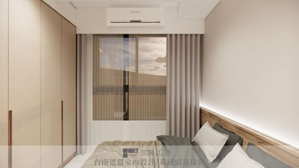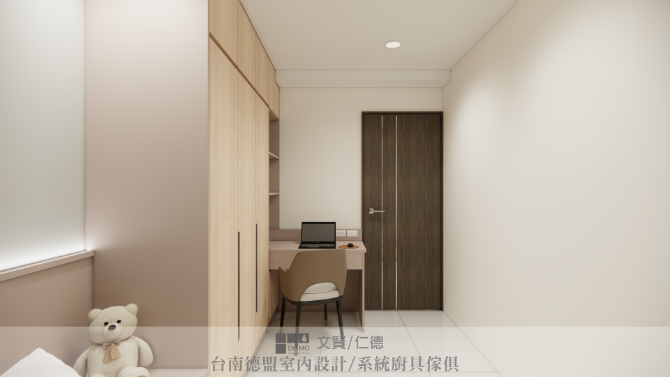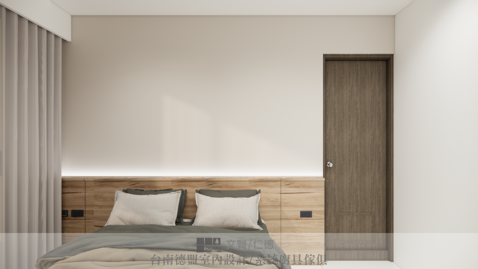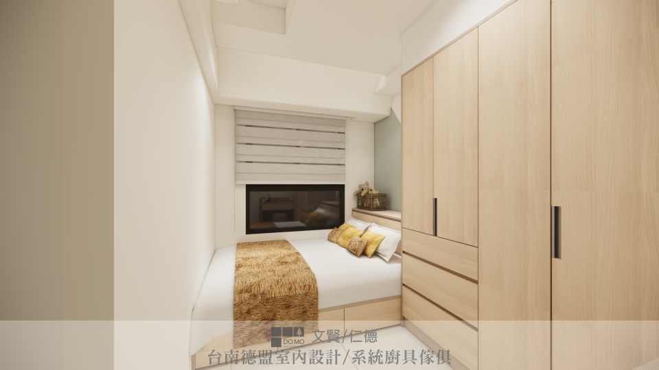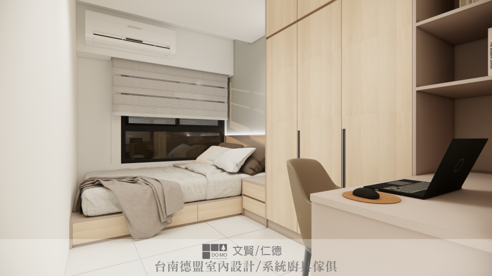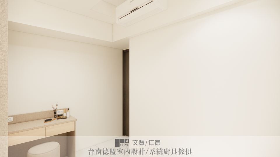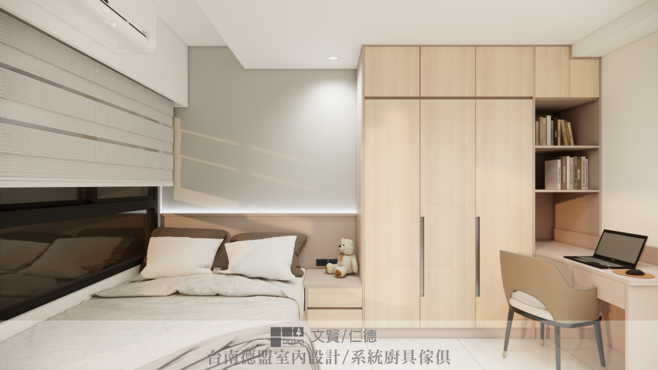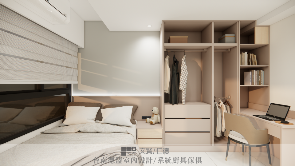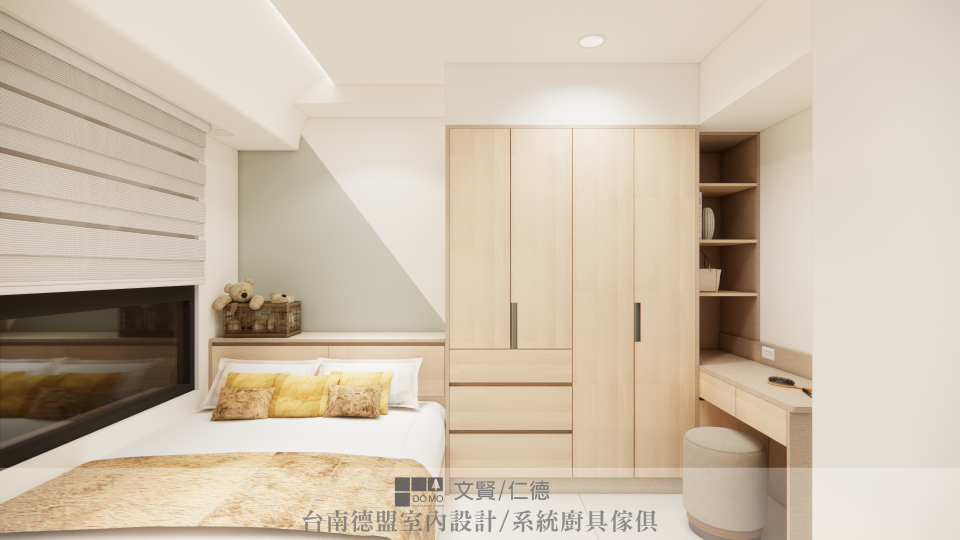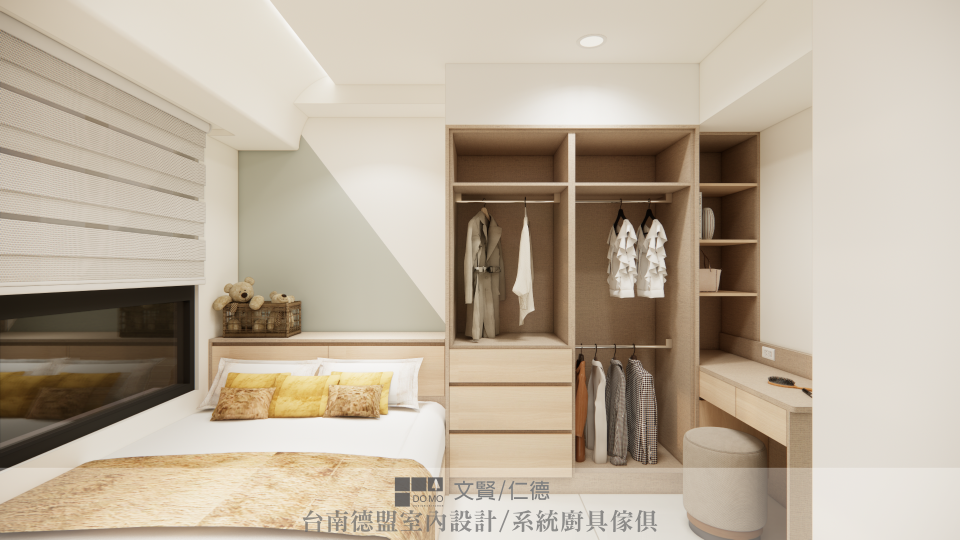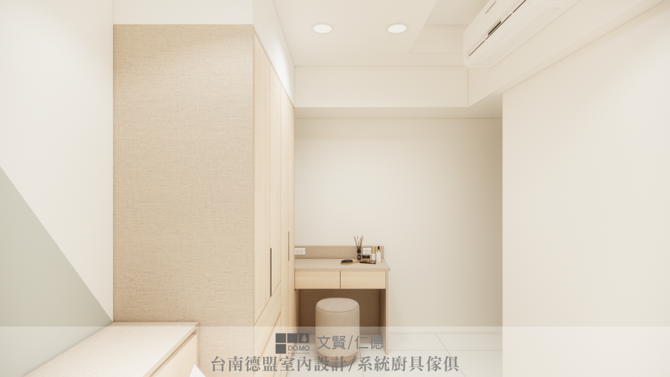 兩間相同格局的臥室,只按需求施作衣櫃與化妝桌,床架也用系統櫃工法一併製作,床底規畫為三抽抽屜,幫助收納更多物品。色系依循公領域的輕柔色調,整體一致,打造舒適宜人的溫馨宅。