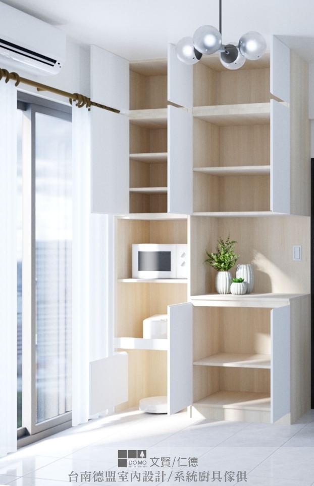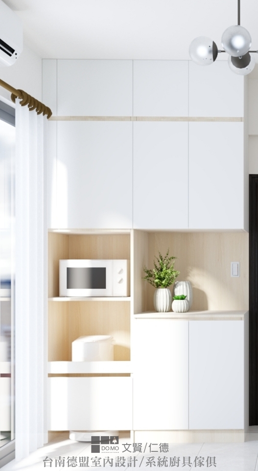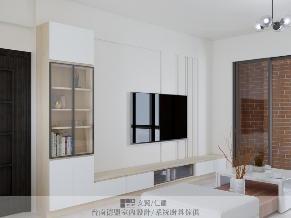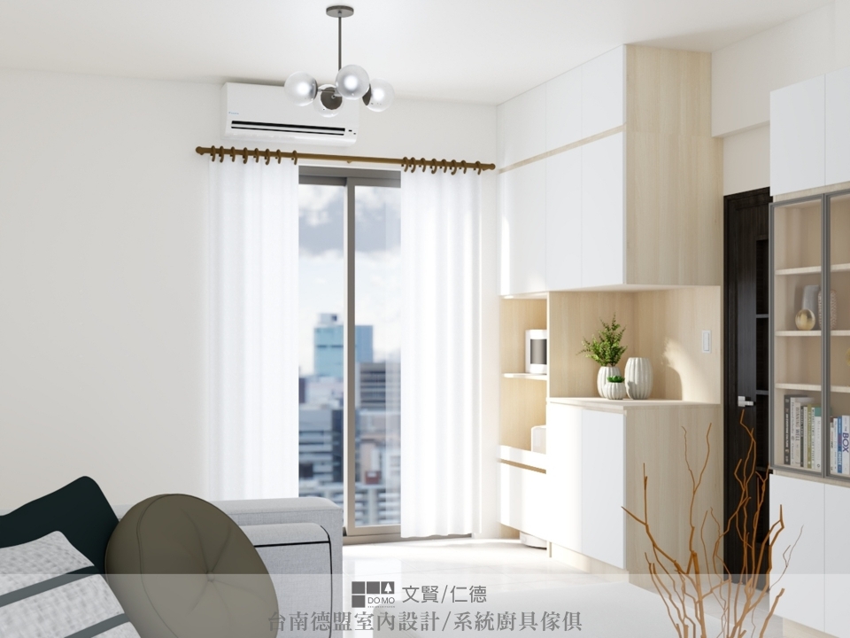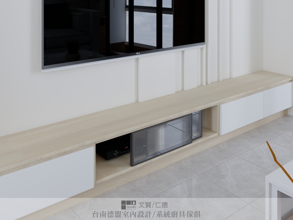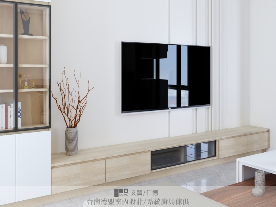電視牆上簡單的線條適度的增加了裝飾感,卻並不顯華麗,並且所有櫃體皆選用溫暖的淺白橡木色搭配暖白色門片,加上採光良好的窗外撒落的陽光,便完成了如日劇場景般清新溫暖的佈局。