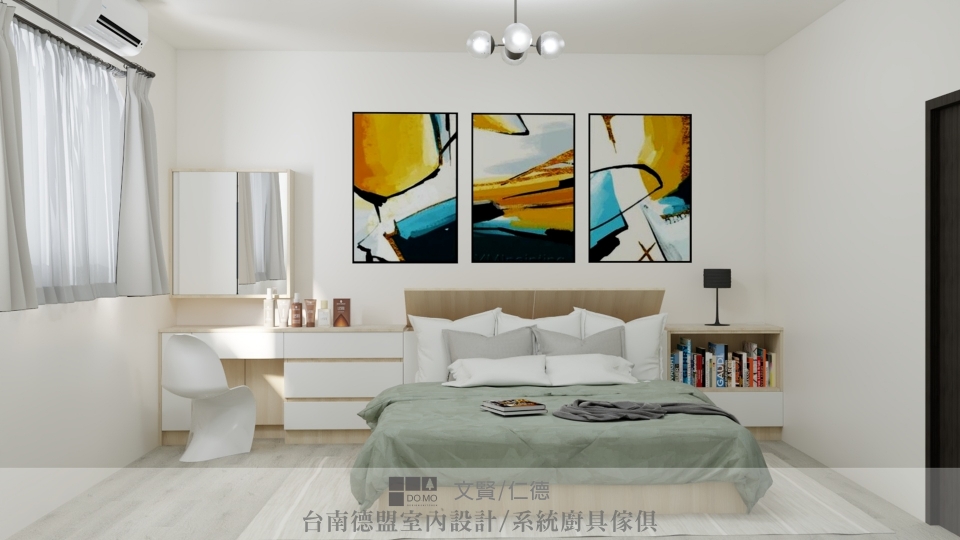 屋主喜愛帶著日系感的簡約風格,也並不太需要大量的收納空間,因此只施作了戶外鞋櫃、電視櫃、玄關電器櫃、臥室床頭櫃及化妝台。