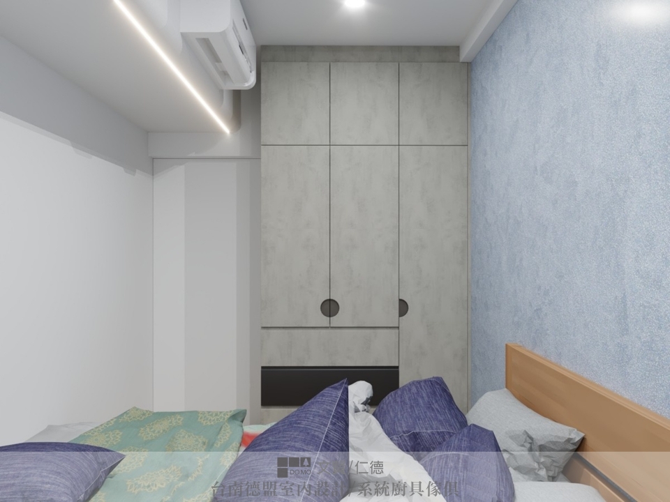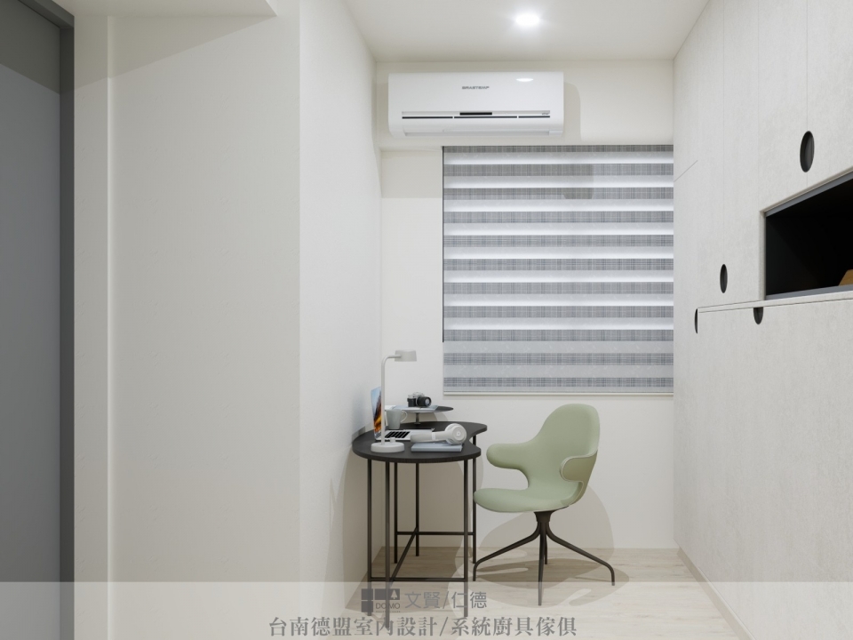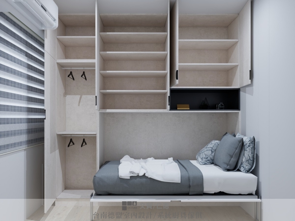 而第二間次臥,平時是作為客房或彈性空間使用,因坪數較小,不太能像一般臥室那樣置入所需家具,設計師便將床榻「藏於衣櫃中」。平時作為書房使用,若有訪客,只需將床榻從衣櫃下拉即可!