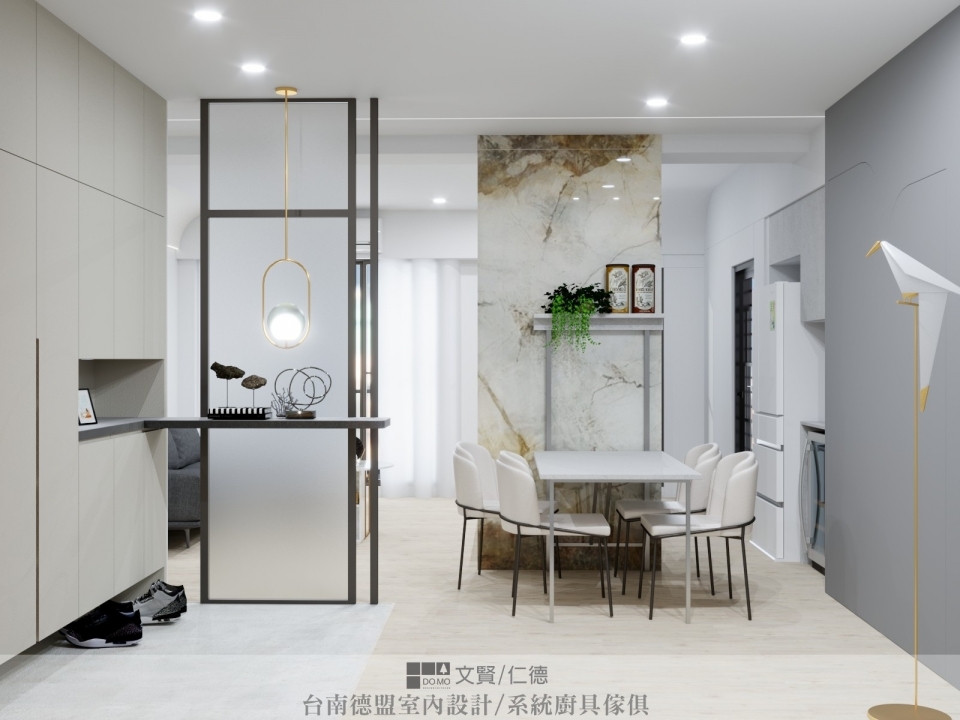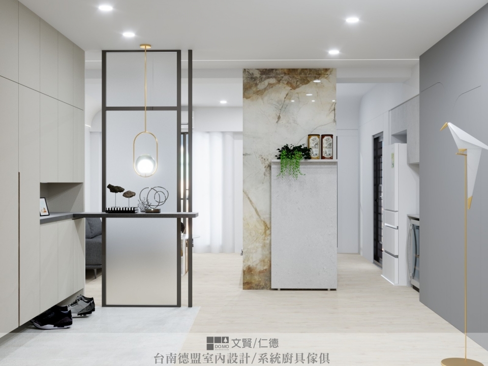 從玄關入門即見寬闊視野,大器磅礡的大理石隔牆矗立其中相當亮眼,左邊則是霧面玻璃隔出的玄關,地面用不同花色的石塑地板將落塵區獨立出來。