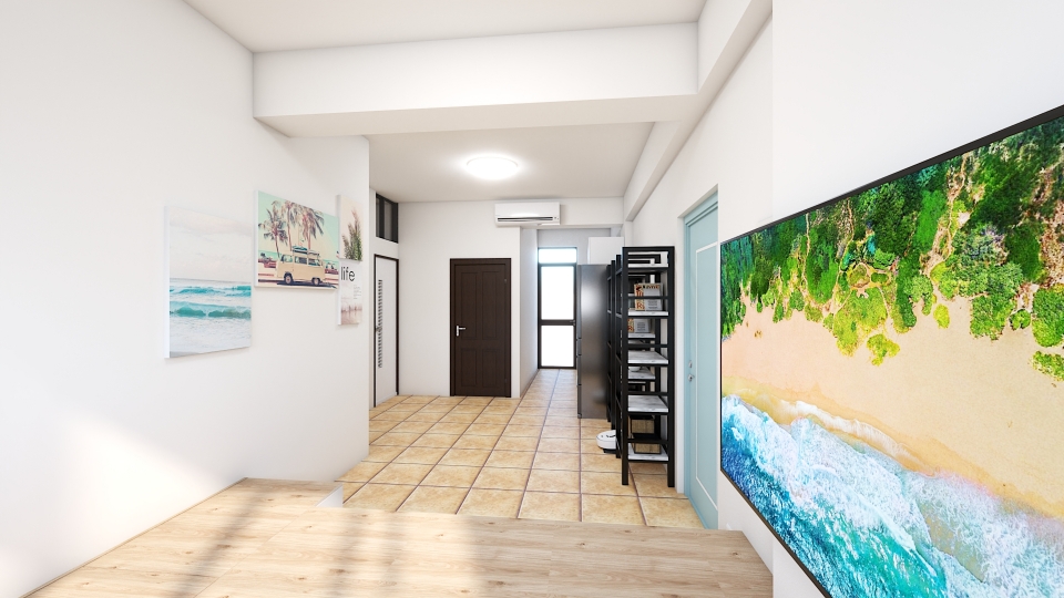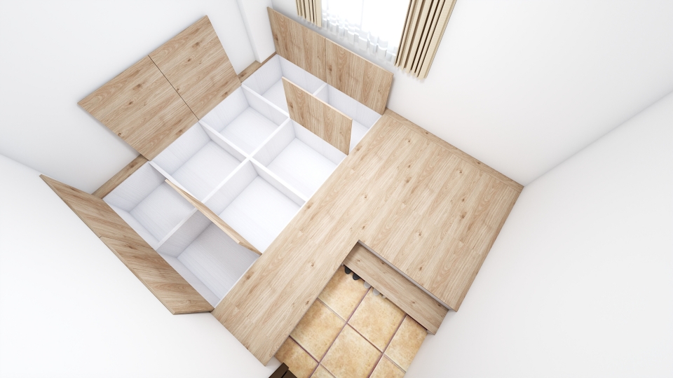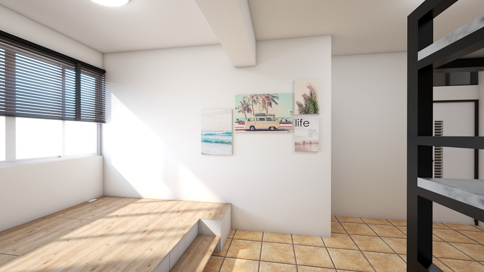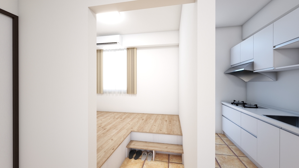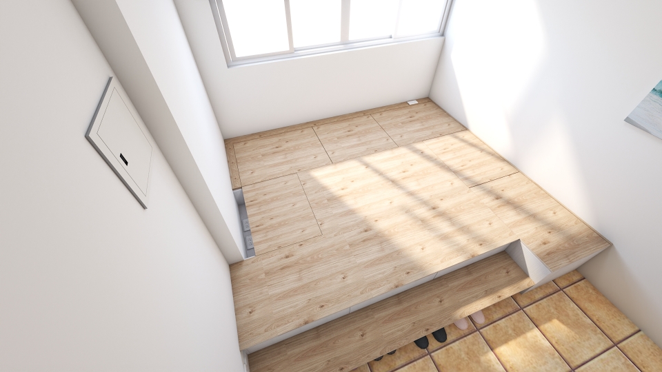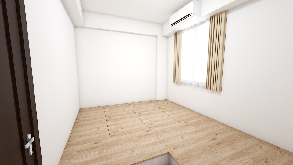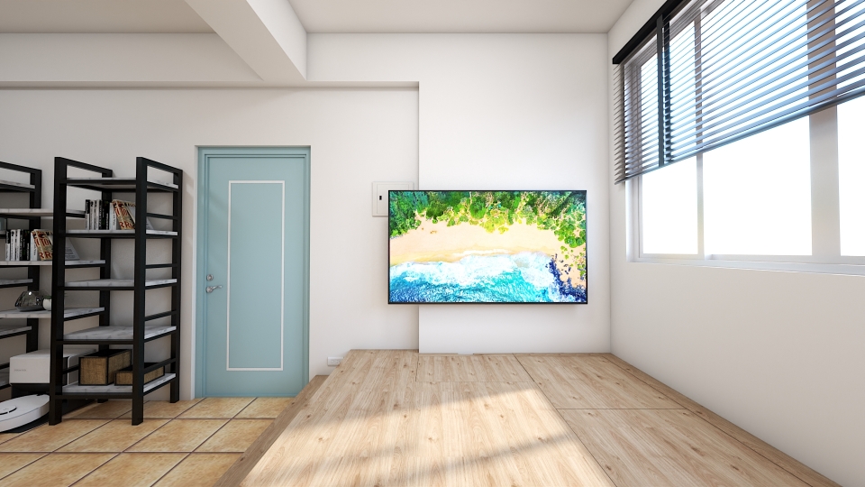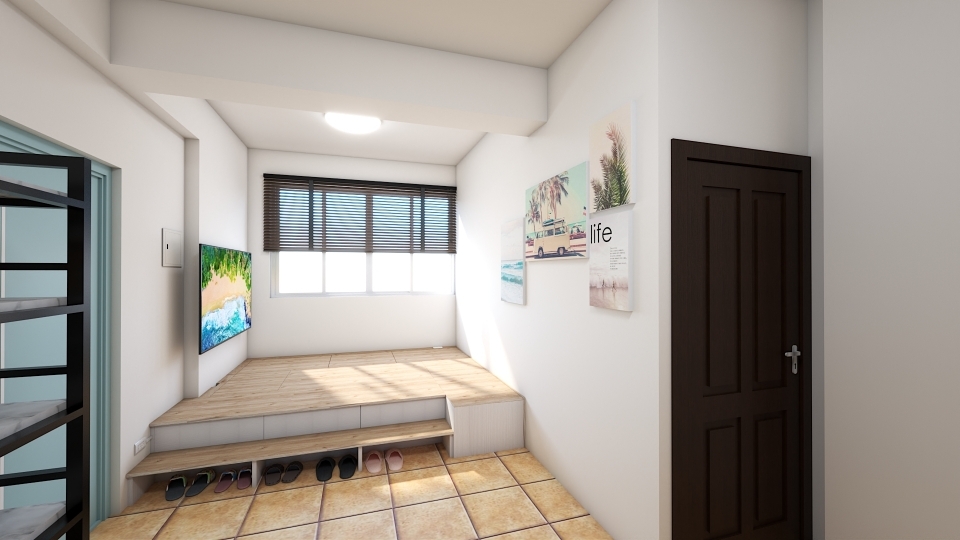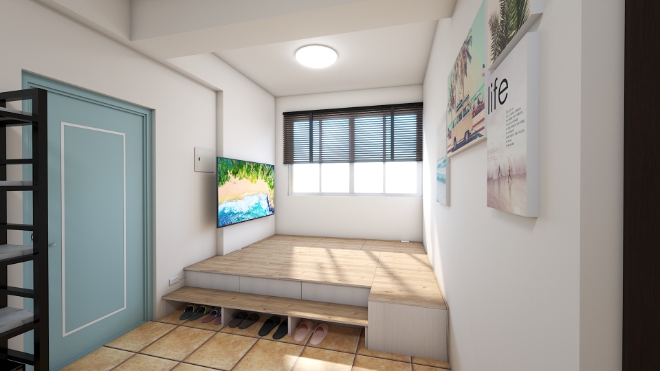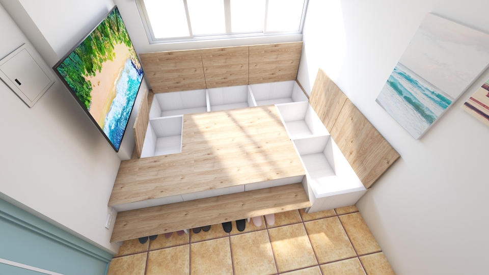 在與業主溝通需求後,將原本的小沙發與茶几拿掉,施作了開放和式架高木地板。 架高木地板的高度一般是建議35-65公分之間,過低收納空間不足,過高反而不方便踩踏、深度過深則取物不易。