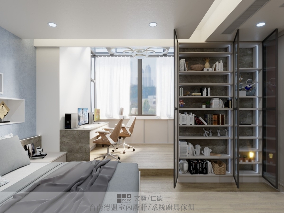 設計師將臥室劃分為書房、臥室、更衣區,巧妙運用收納櫃及架高地板分割空間,半開放式的作法讓各區域獨立又不相互打擾。