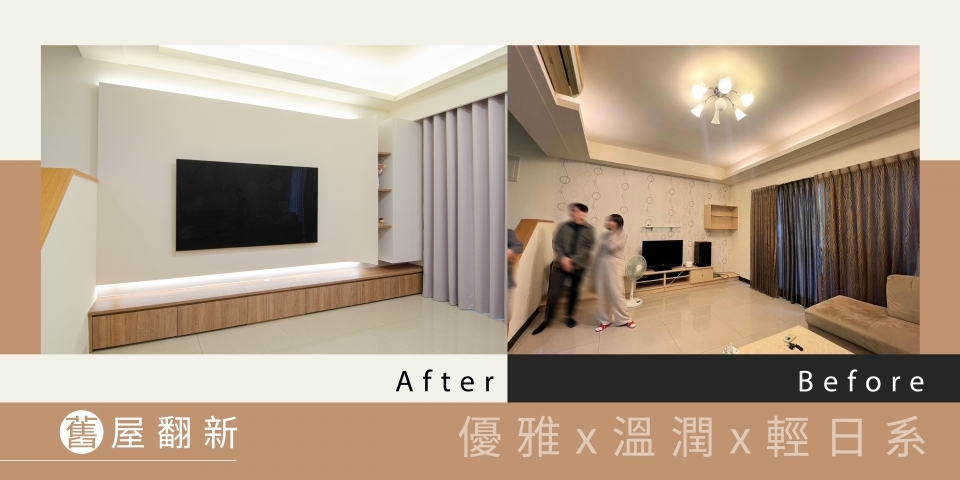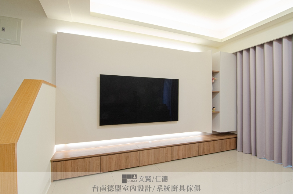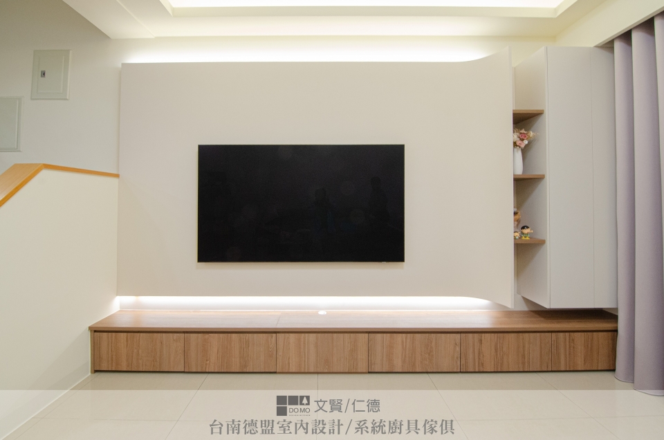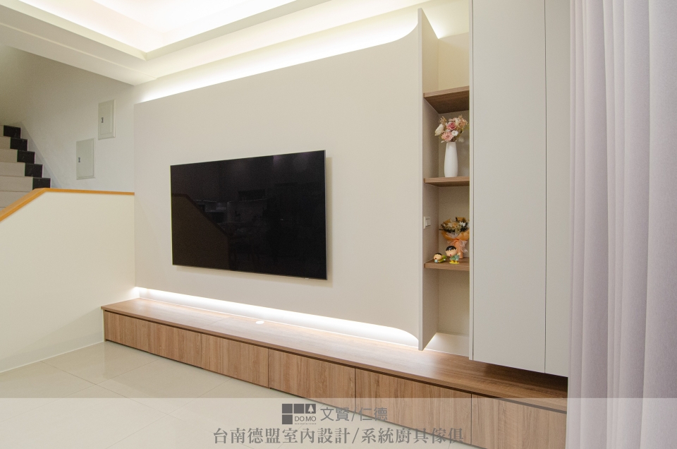 客廳電視牆原本貼了造型壁紙,以及明顯功能不足的電視櫃,經過改造,做曲面的素面水泥灰牆上下方皆嵌入氣氛燈條,底部是線條明顯的橡木色,溫潤和諧又不失寡淡,搭配起來相得益彰。