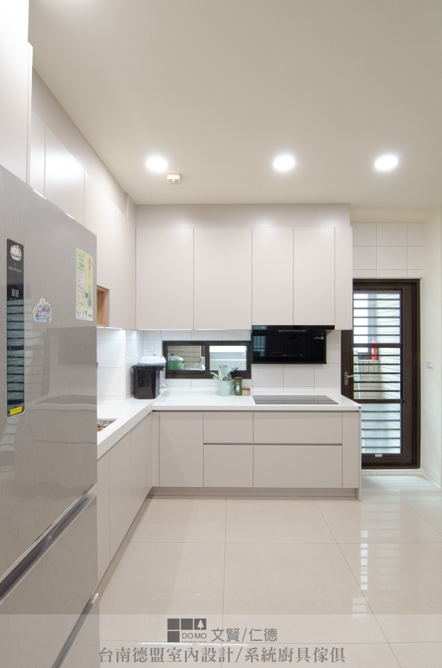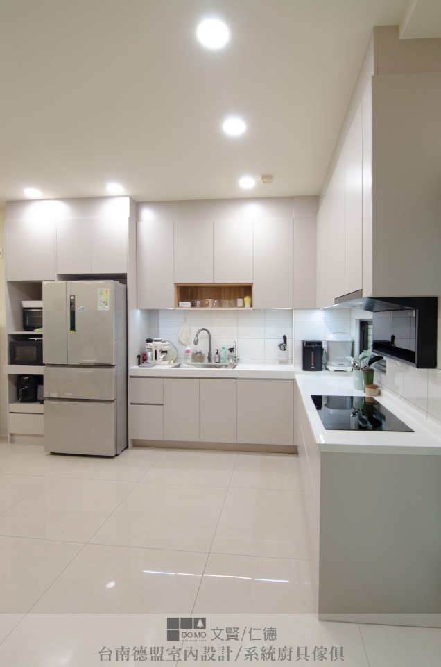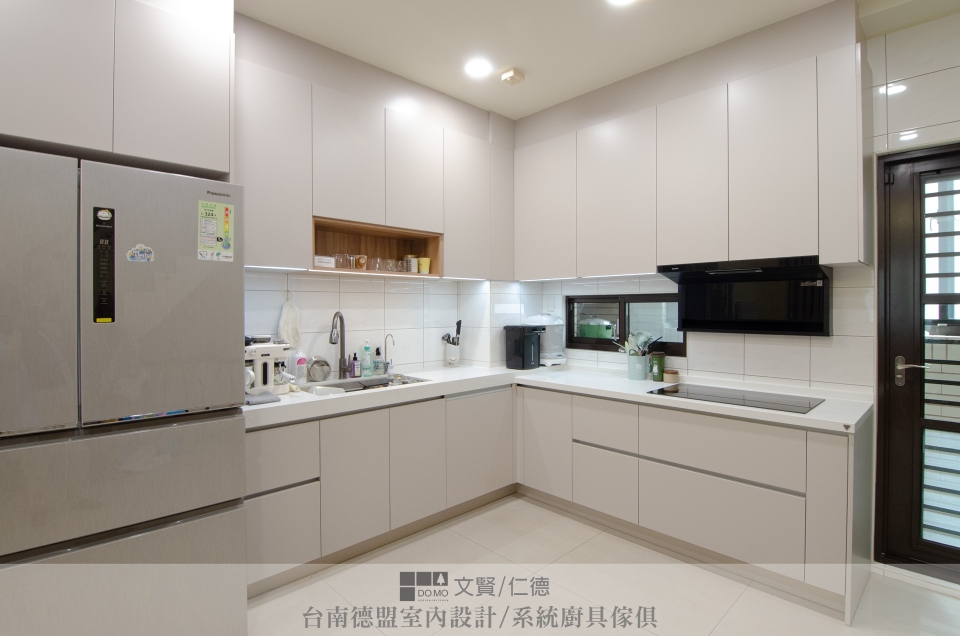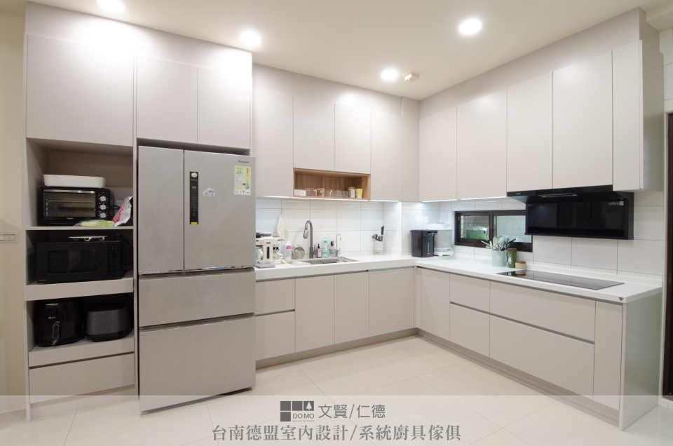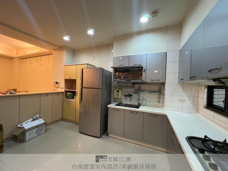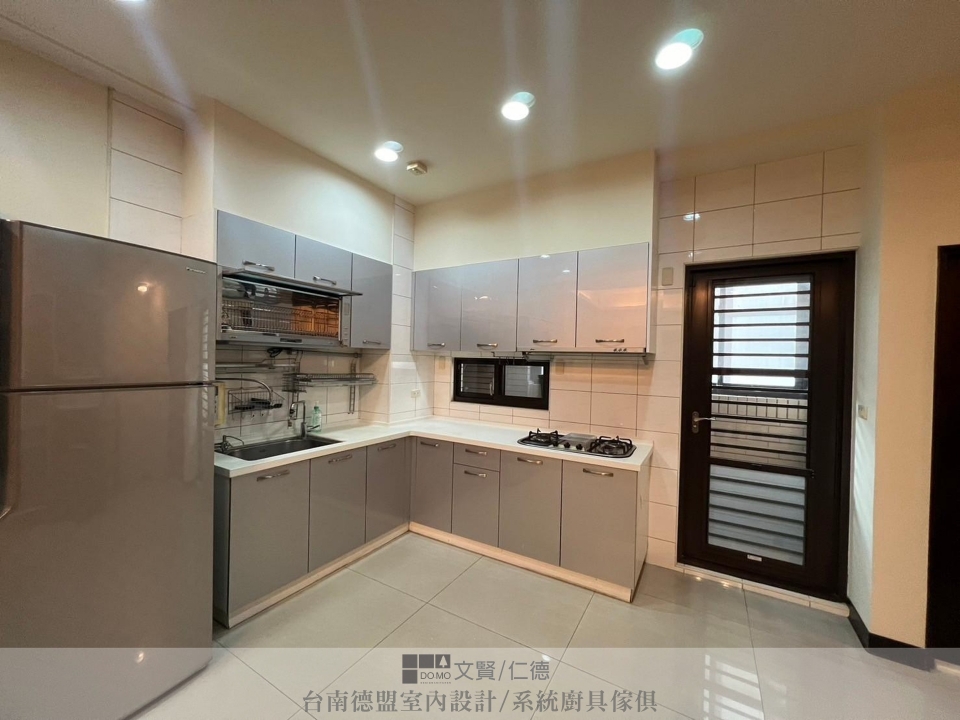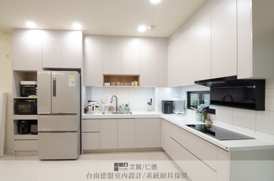 廚房原是銀灰色的結晶鋼烤門片,整組廚具重做,本來沒做的電器櫃補上了,色系換成與客廳相仿的羊絨灰色,並選擇霧面烤漆門片,整體溫柔又優雅。