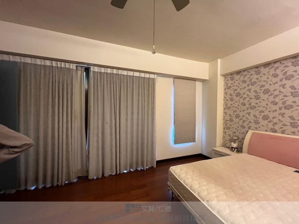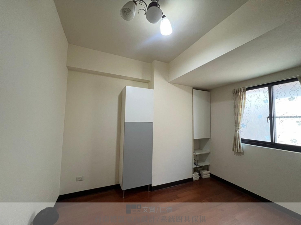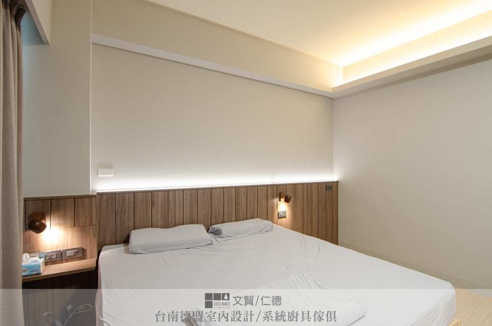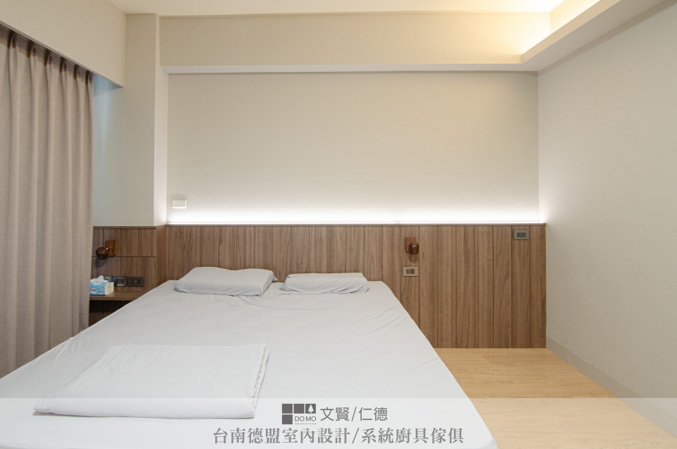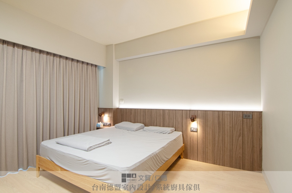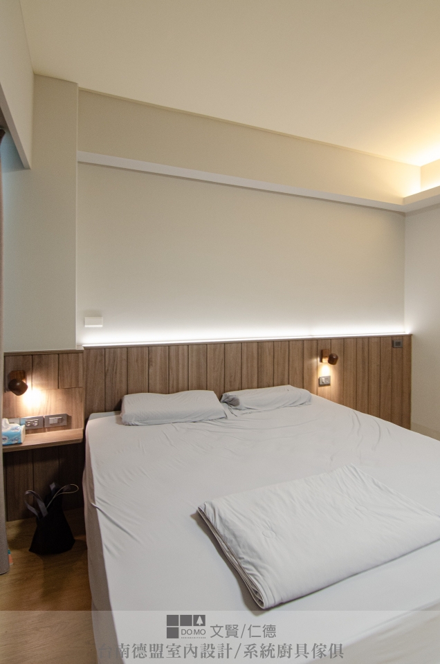 而臥室與書房首先將復古感十足的地板換成淺色系木紋,拆除壁紙、重做衣櫃與書櫃,隨即煥然一新,打造極具日系韻味的簡約私領域。值得一提的是書房裡的書櫃位置卡了一支大柱,設計師索性用大片塑合板遮蓋,規劃成與書櫃一體的假牆,畫面不因大柱子而被分割,看上去協調又一致!