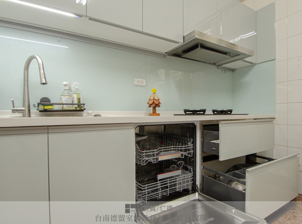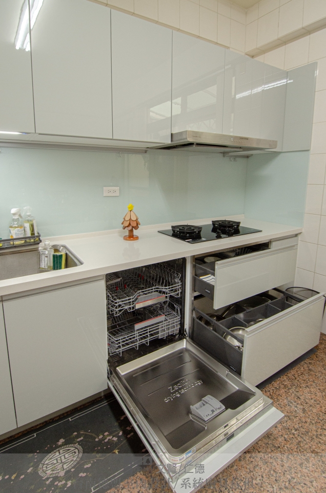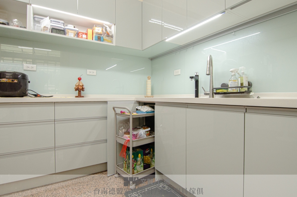 此外還加裝了洗碗機,右側是收納櫃,可相當順手將清洗好的碗盤歸位。並且設計師為業主規劃了隱藏式推車的設計,平時不使用時隱藏在櫃內,使用時打開櫃門,即可將放置了清潔用品的推車拉出來,可隨著使用者移動!推車拉出來後還有個小巧思,因位於轉角而使用率不高的收納櫃問題,因加裝抽拉盤而解決了!