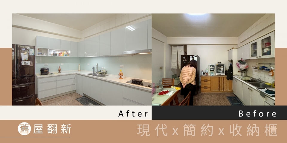 經過改造後,原本昏黃、凌亂的廚房改頭換面,用現代明亮的簡約風格再陪伴業主度過下一個十年~