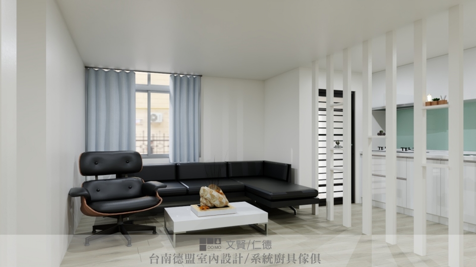 本案是26年的大樓舊屋翻新,舊有的裝潢與櫃體拆除,依據現今居住者的喜好與習慣重新規畫打造。地板全面鋪設SPC石塑地板,略淺帶灰的木紋色清新不失沉穩。屋中施作的櫃體皆以白色為主,於不同空間搭配不同的色彩作為跳色,顯得活潑輕盈,為空間帶來新氣象。