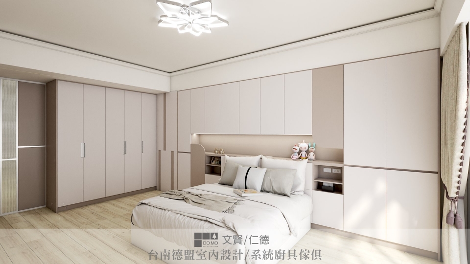 整個二樓都是主臥室的領域,一共分為兩區,分別是臥室及更衣室。面積相當足夠的主臥,可以在擁有套房的完整機能後還保有相當充裕的空間,電視櫃、床頭靠牆、展示櫃、衣櫃皆俱全,全室則是由低彩度的輕柔奶茶色系堆砌而成。