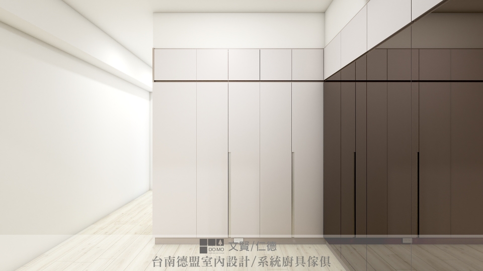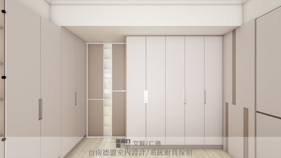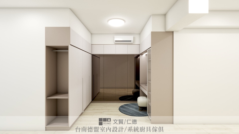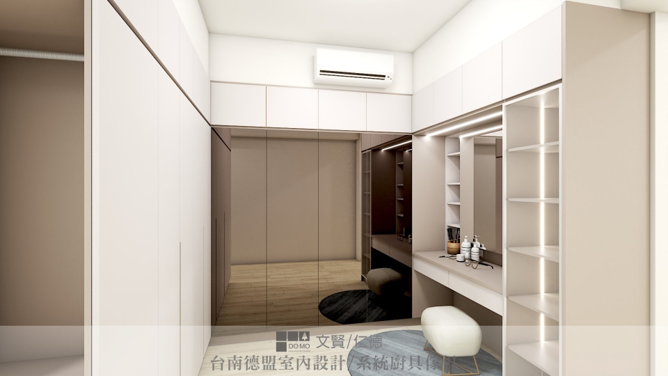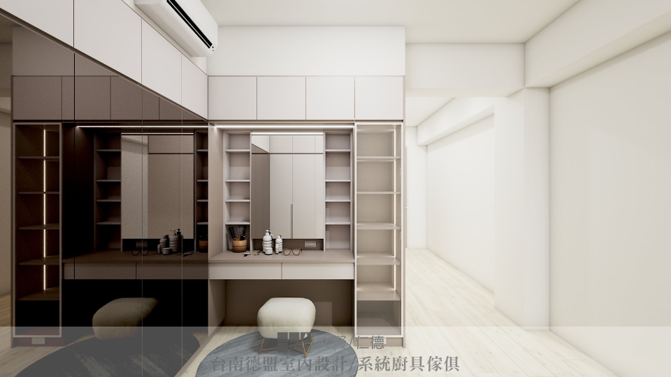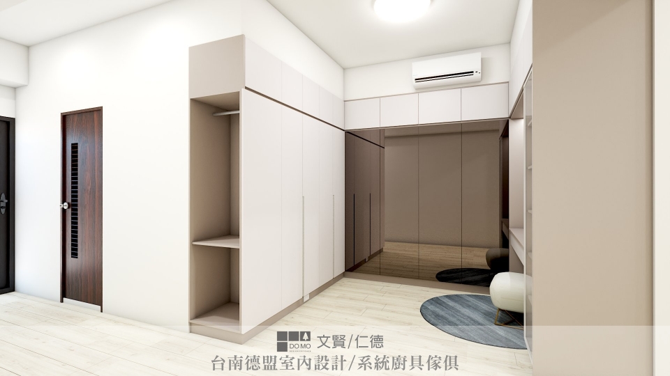 ㄇ字型的更衣室,大膽將一整片的衣櫃門片更換為鏡面,茶色鏡與空間中的色系相互映,更顯和諧。
