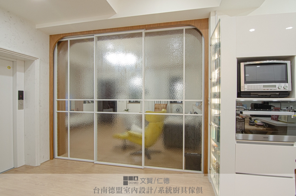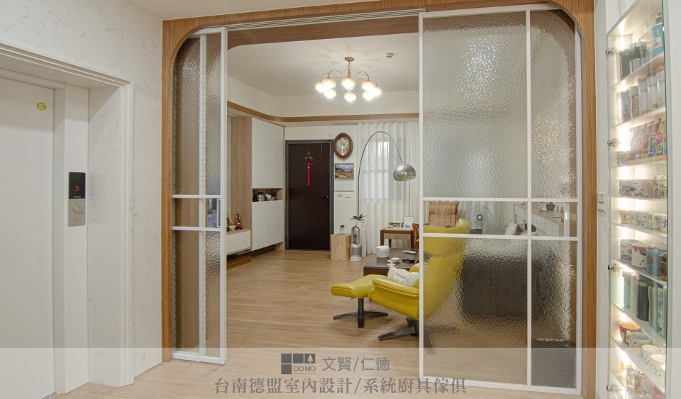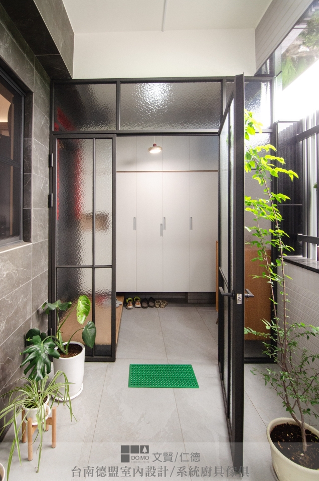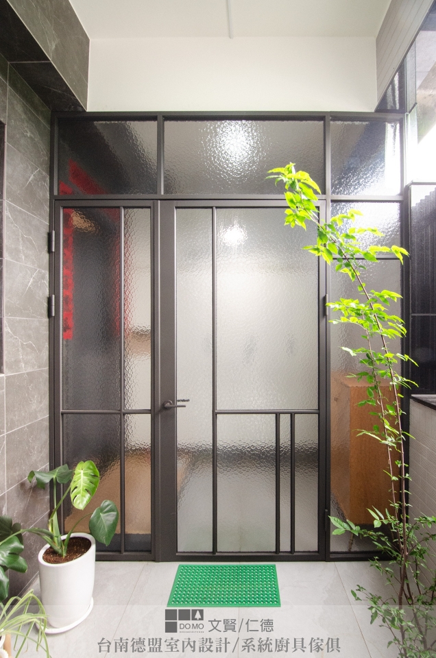 此次案子為透天宅,大門外是露天設計,經商討後,設計師於樑下加裝一道玻璃門,使大門外形成一處密閉空間,放置其中的鞋櫃也免於風吹雨打,水波紋的紋理保護業主隱私。