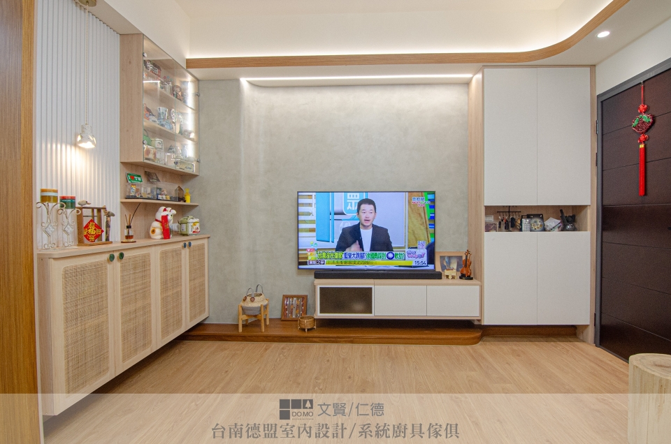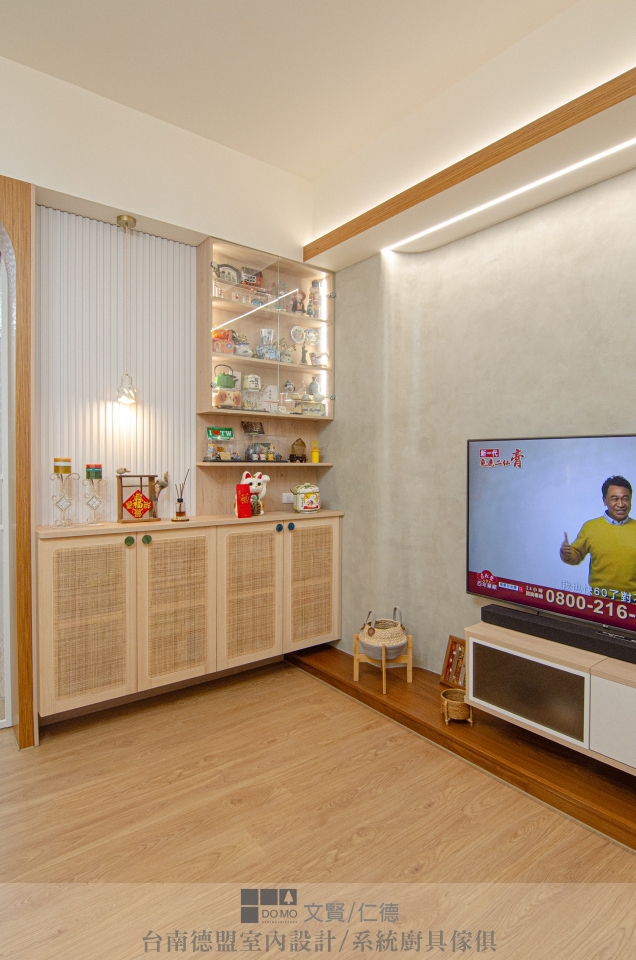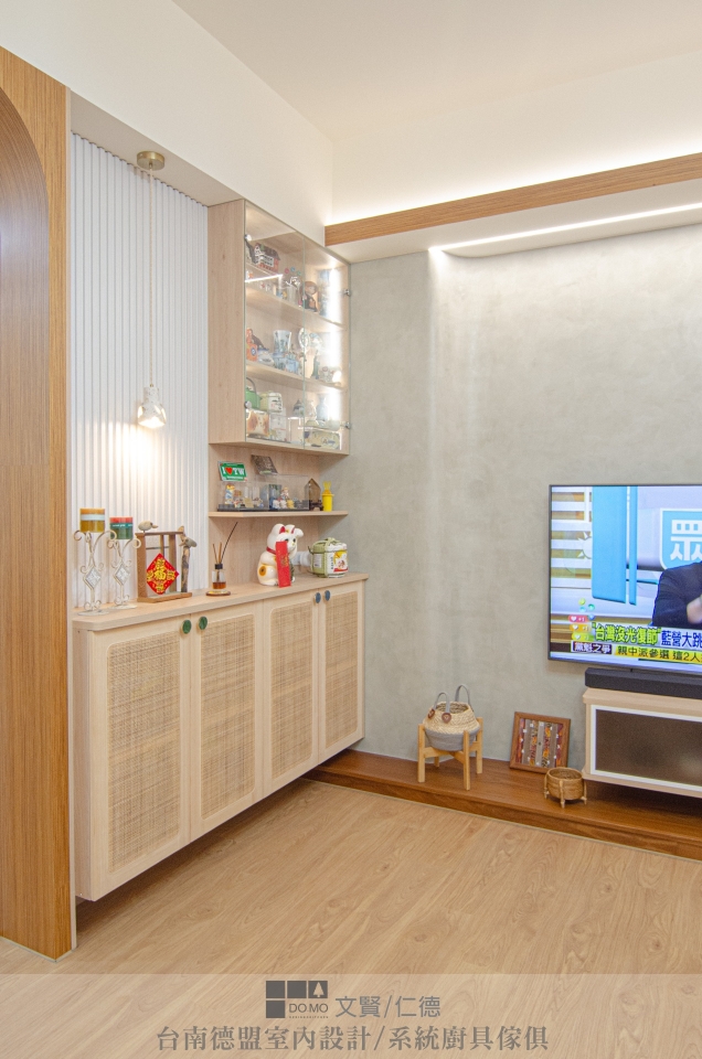 客廳中最引人注目的莫過於素雅的司曼特漆電視牆及側邊的展示櫃,櫃體門片加入藤編材質,不僅透氣,也注入設計感,使單調的櫃體成為空間中最獨特的端景,且藤編材質也減輕櫃體的厚重感,為空間注入樸實又自然的氛圍。