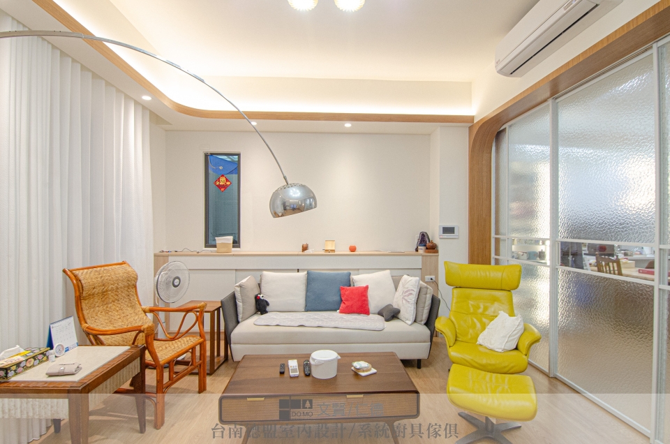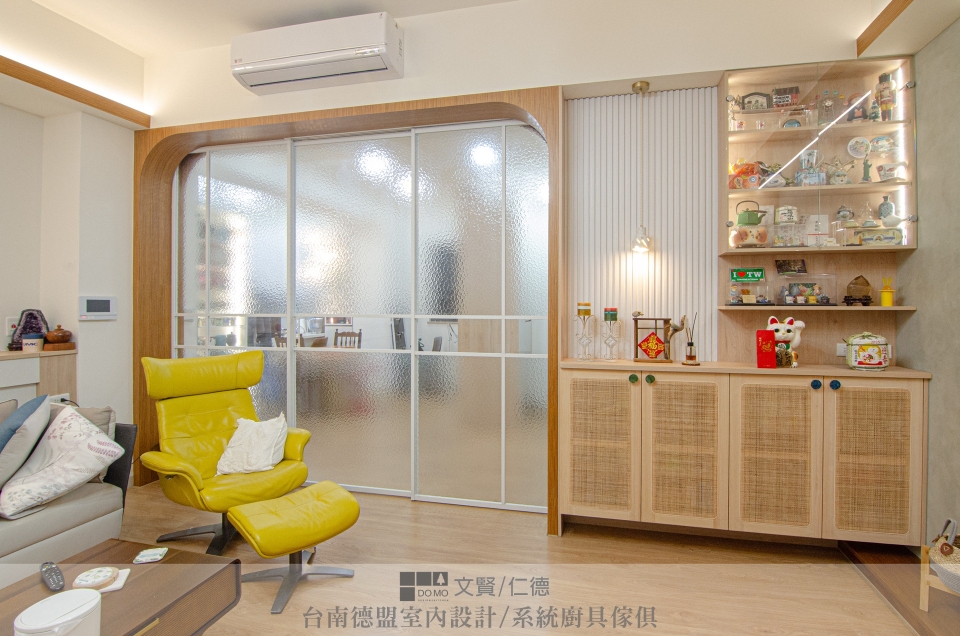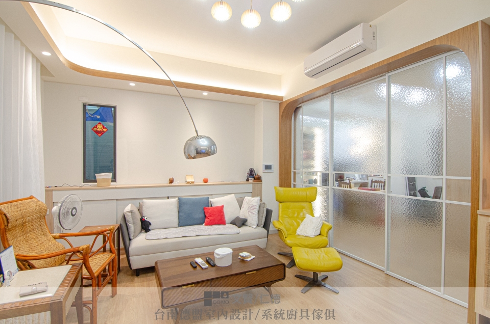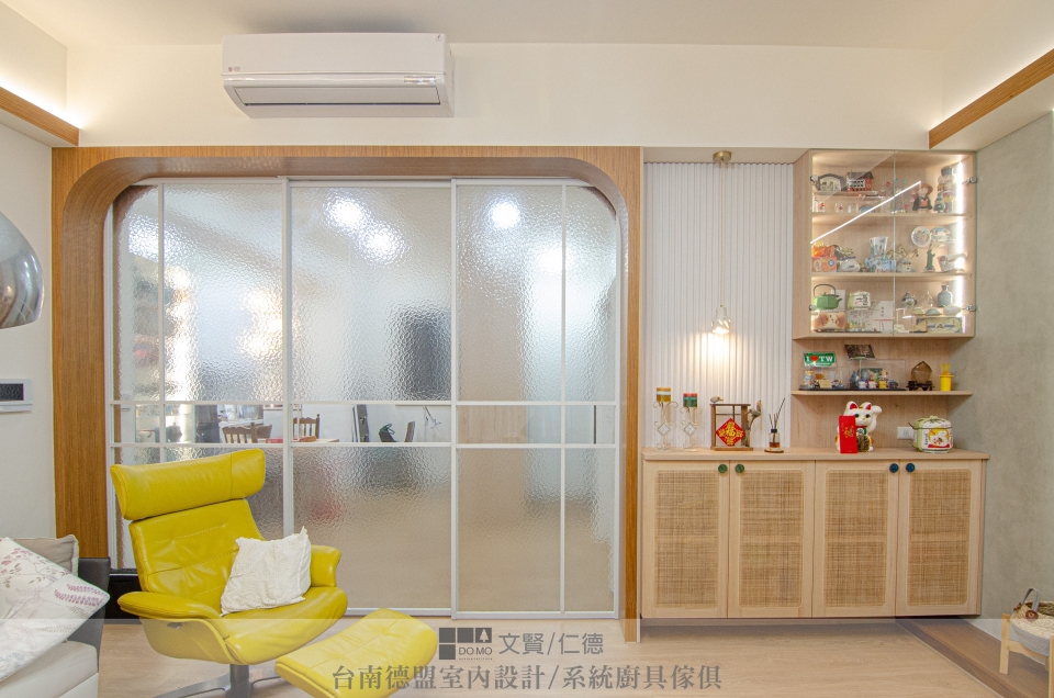 一樓公領域為客廳及餐廚區,兩空間中有道突兀的大樑柱,如若封天花板又會使樓高太低,於是設計師利用拱門弧線來修飾,便破除橫樑帶來的壓迫感。再裝設玻璃推拉門,將兩個空間獨立劃分,互不打擾。