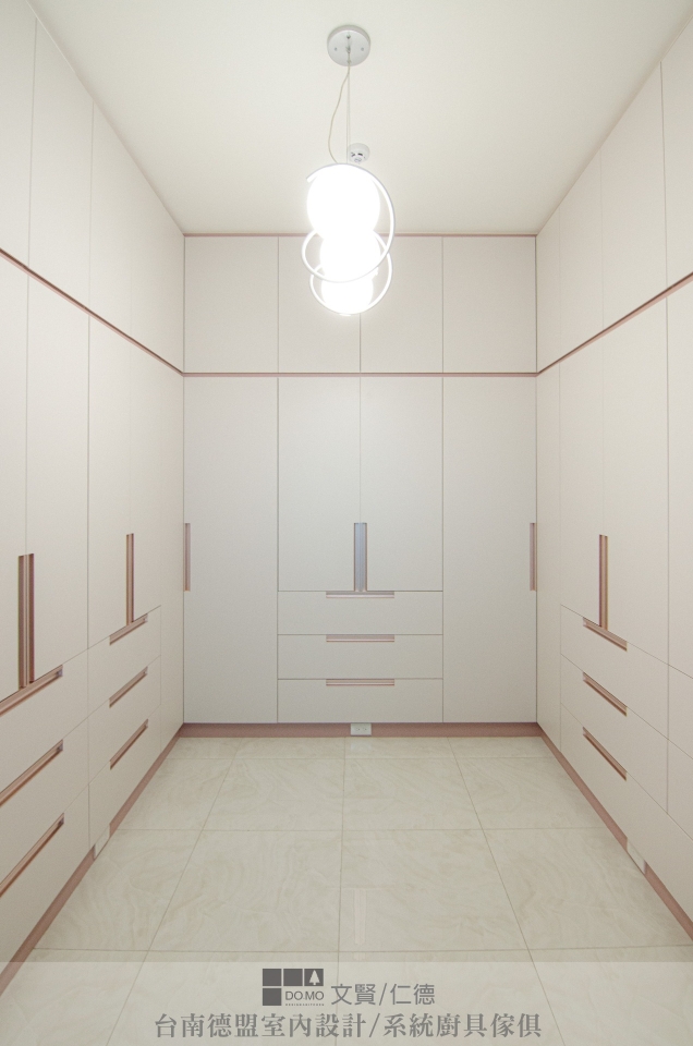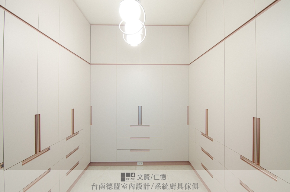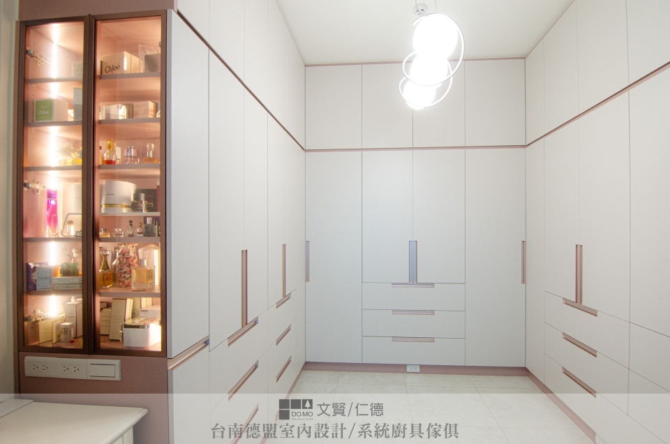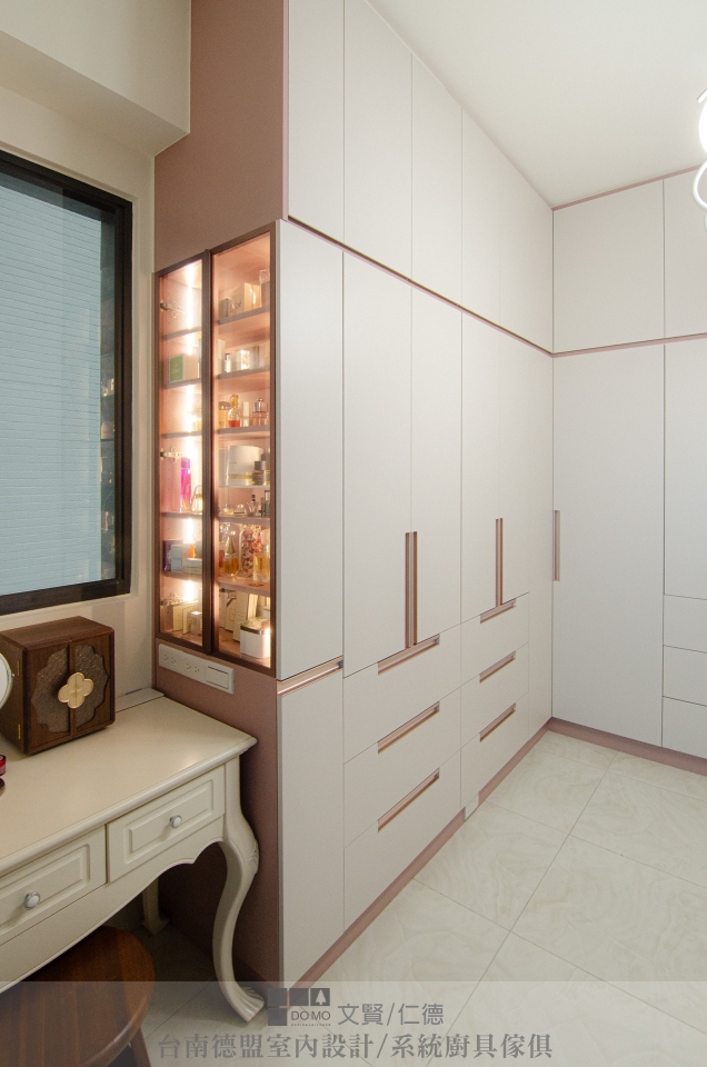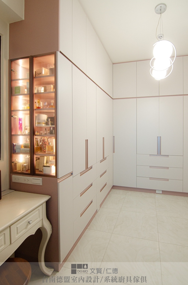 更衣室的配色充斥浪漫氛圍,素雅白與玫瑰粉再加上玫瑰金五金,打造經典夢幻少女系風格!