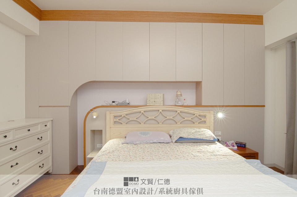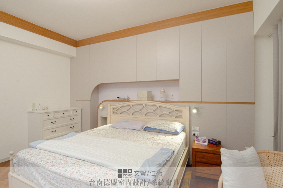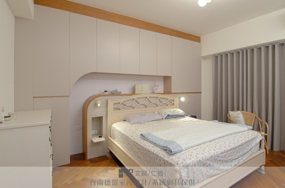 主臥室沿襲一樓公領域的簡潔素雅風格,輕柔的米灰色刷漆使私領域瀰漫舒心氛圍,衛浴出入口特意改為隱藏推拉門設計,使其整體一致。