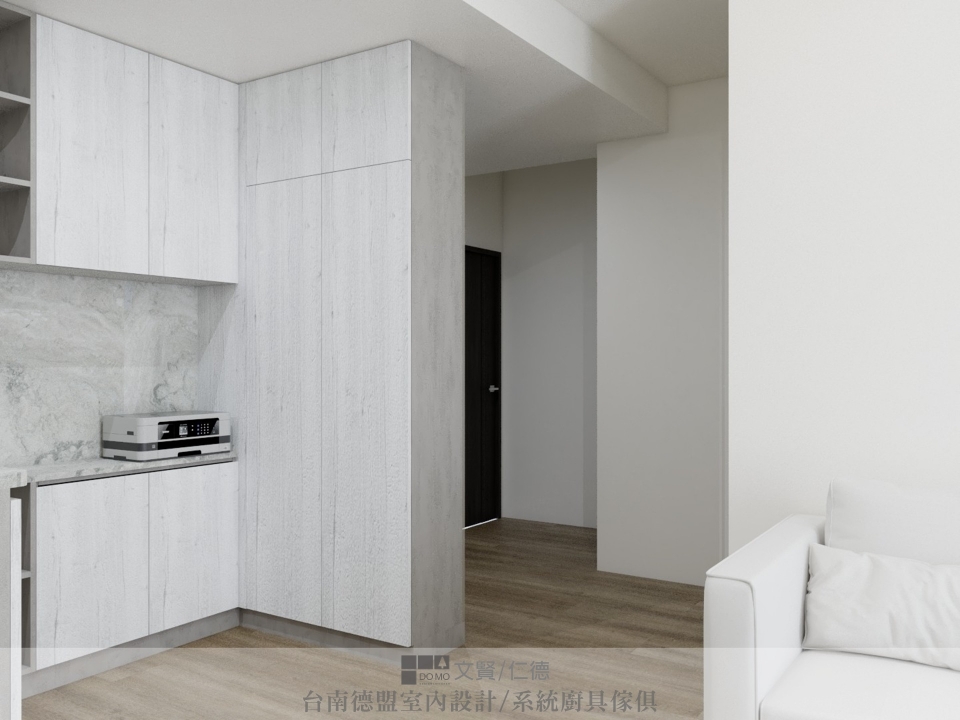 增設的鐵件玻璃拉門將餐廚空間的煙火氣阻隔於內,灰白色的木紋櫃體散發類侘寂風格的味道,地面鋪設的暖色系SPC防水地板則適當中和了空間中的冷調,構築了獨屬於業主的寧靜輕淺時光。
