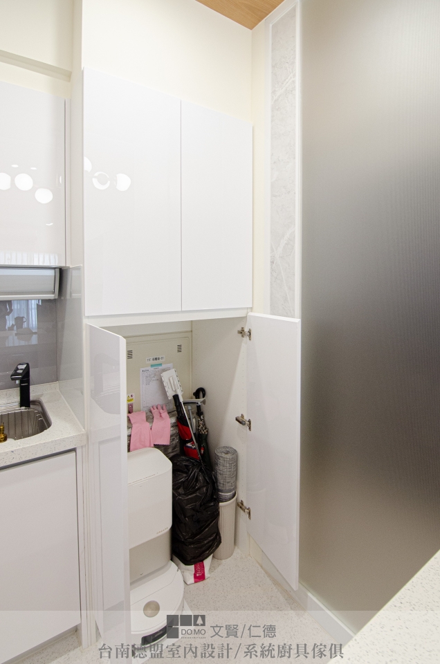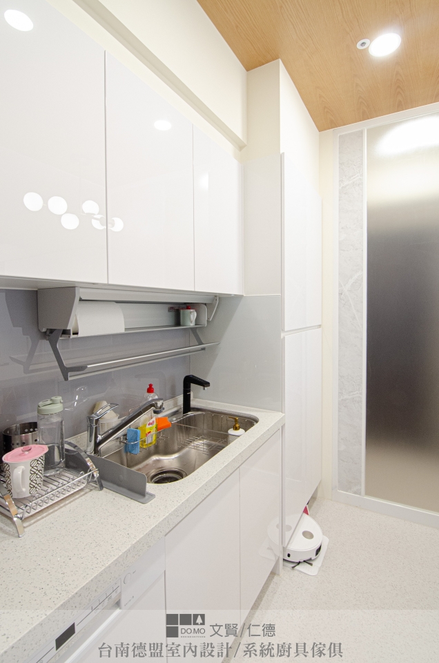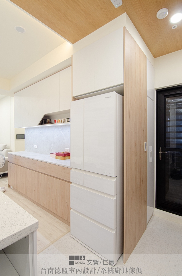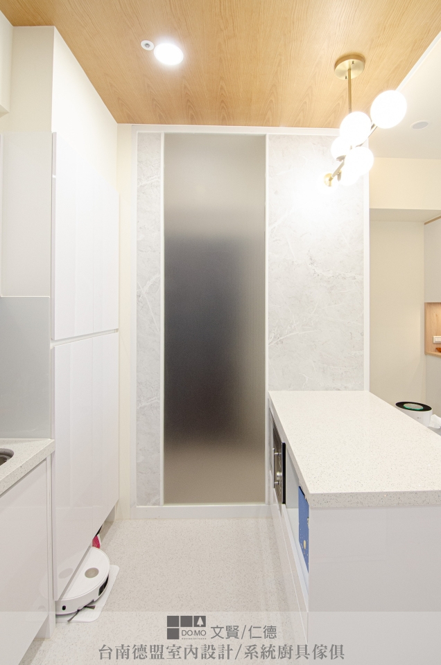 礙於格局關係,大門邁入便先直面廚房,因此加設一道霧玻隔屏,另一側牆面則是安裝與整體色系相近的茶色玻璃,將大門入口出形成玄關空間。
