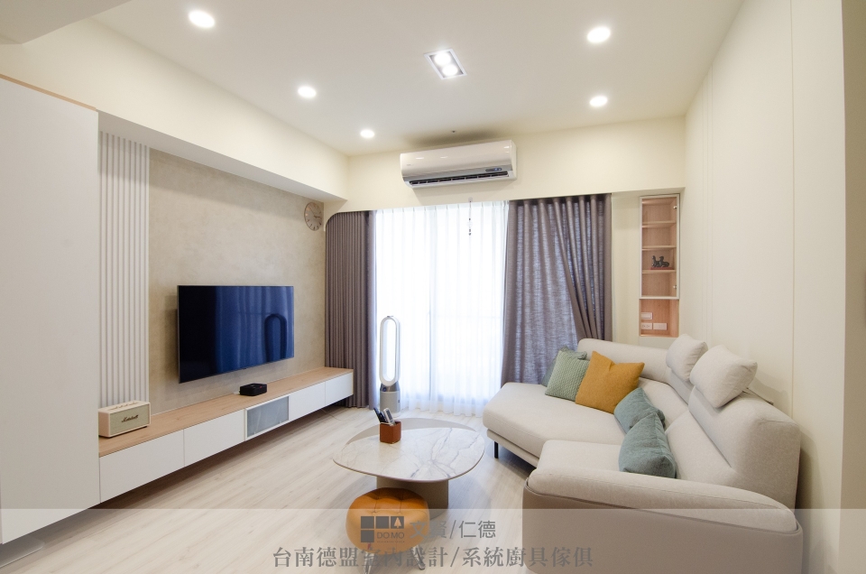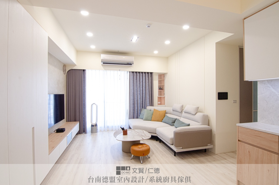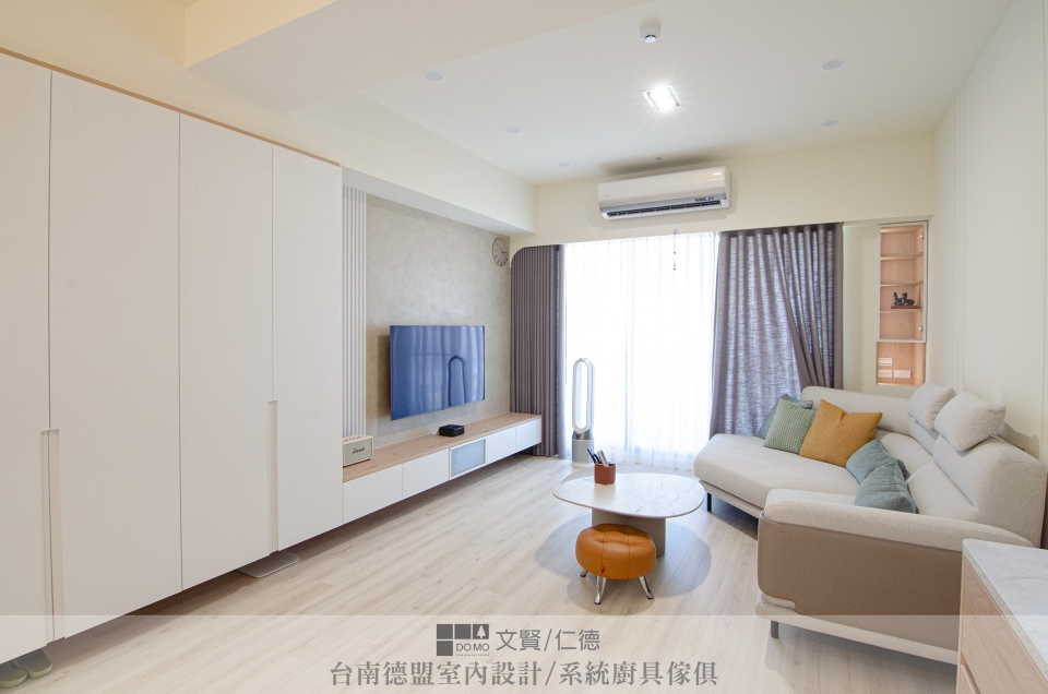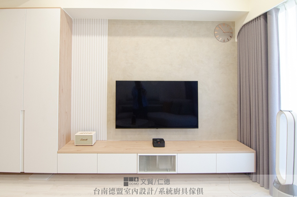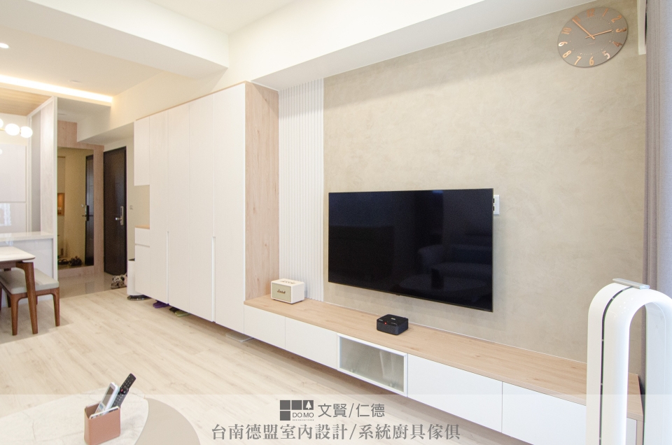 客廳因良好的採光顯得十分通透明亮,輕淺的木紋地板與稍微再深一些的櫃體木紋交疊出層次感,富有手刷紋理的藝術牆更是注入自然溫度。並另外切分了部分空間搭出隔間作為更衣室使用。