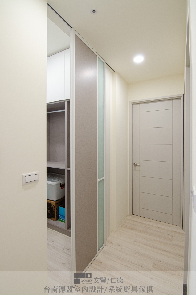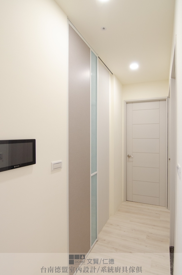 礙於格局關係,大門邁入便先直面廚房,因此加設一道霧玻隔屏,另一側牆面則是安裝與整體色系相近的茶色玻璃,將大門入口出形成玄關空間。