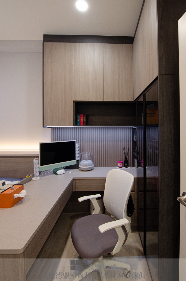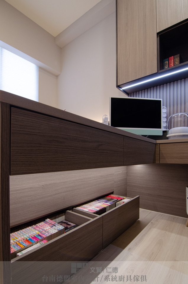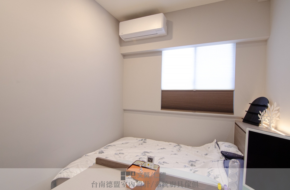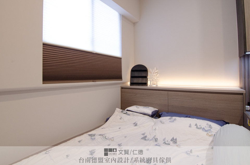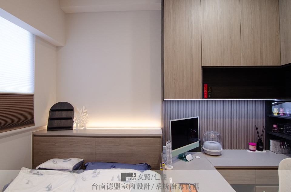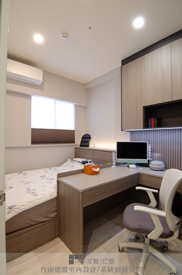 次臥空間較為不足,但設計師巧妙將書桌調換方向,形成ㄇ字型,而非傳統靠牆放置,這麼一來便放大了書桌的使用空間。而書桌背板緊靠床架,下方開孔能抽拉床架的抽屜來置物,絲毫不浪費收納空間!