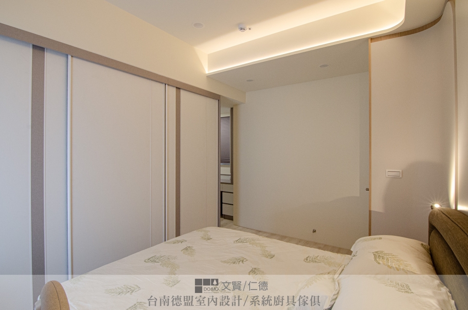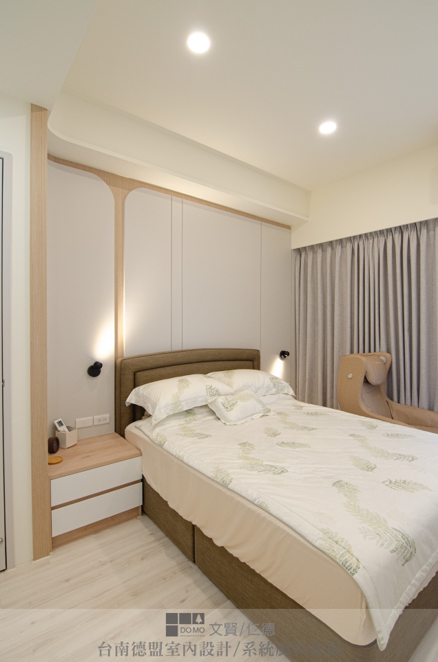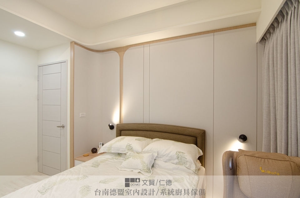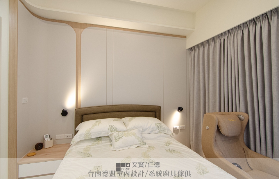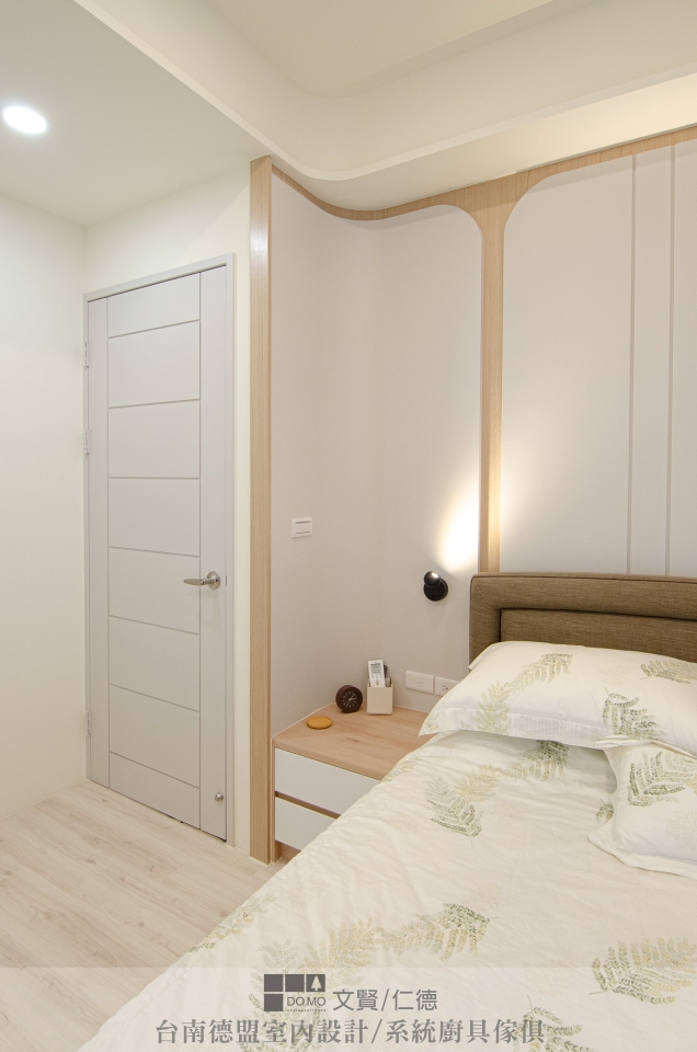 主臥中最為亮眼的莫過於床頭那一片曲面造型牆,精準的曲線將入口處與牆面並不水平的拐角完美收容其中,彌平不平整的突兀感,優雅的曲面造型也展現出木工的匠人工藝。