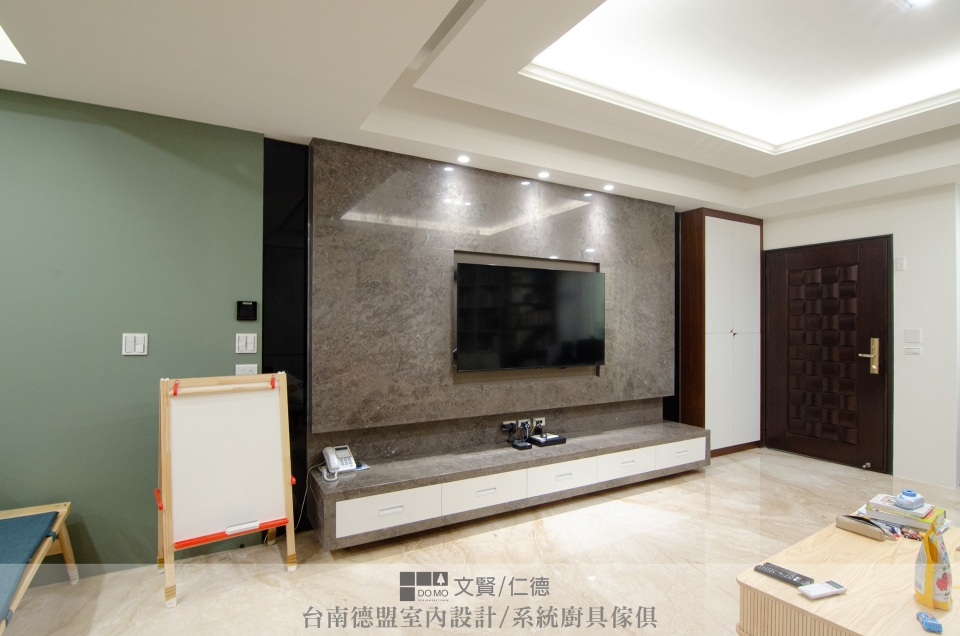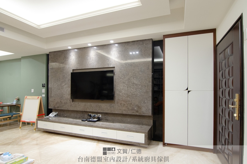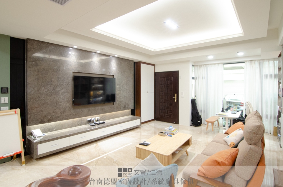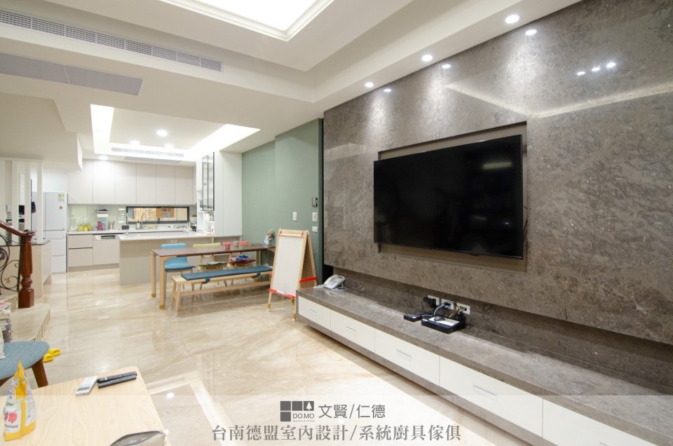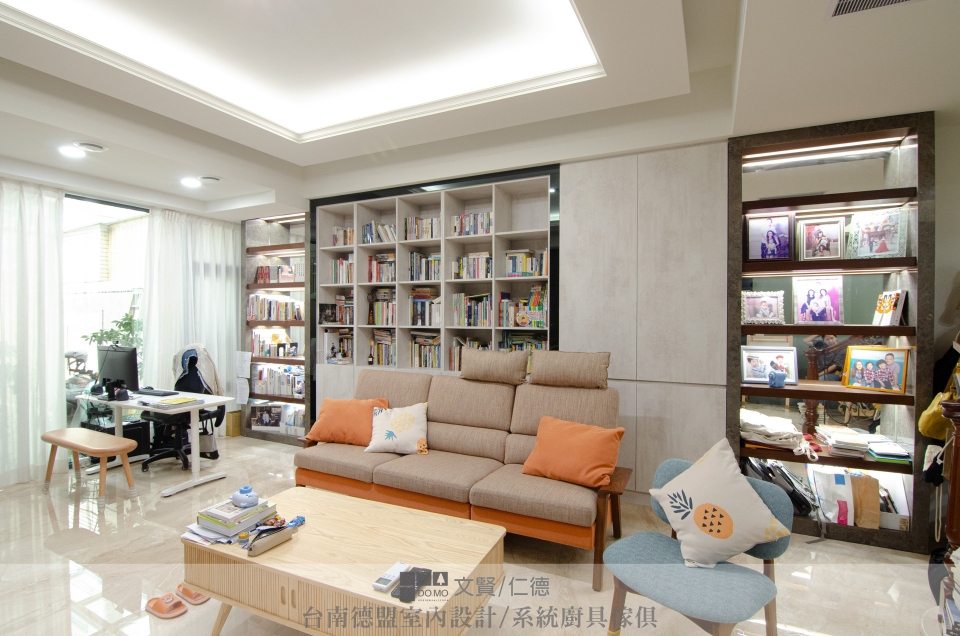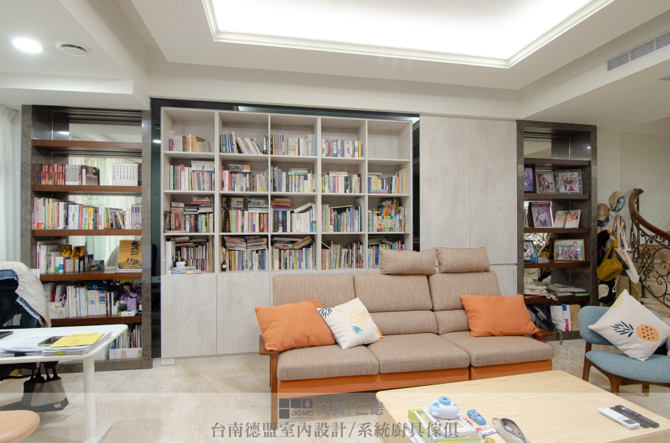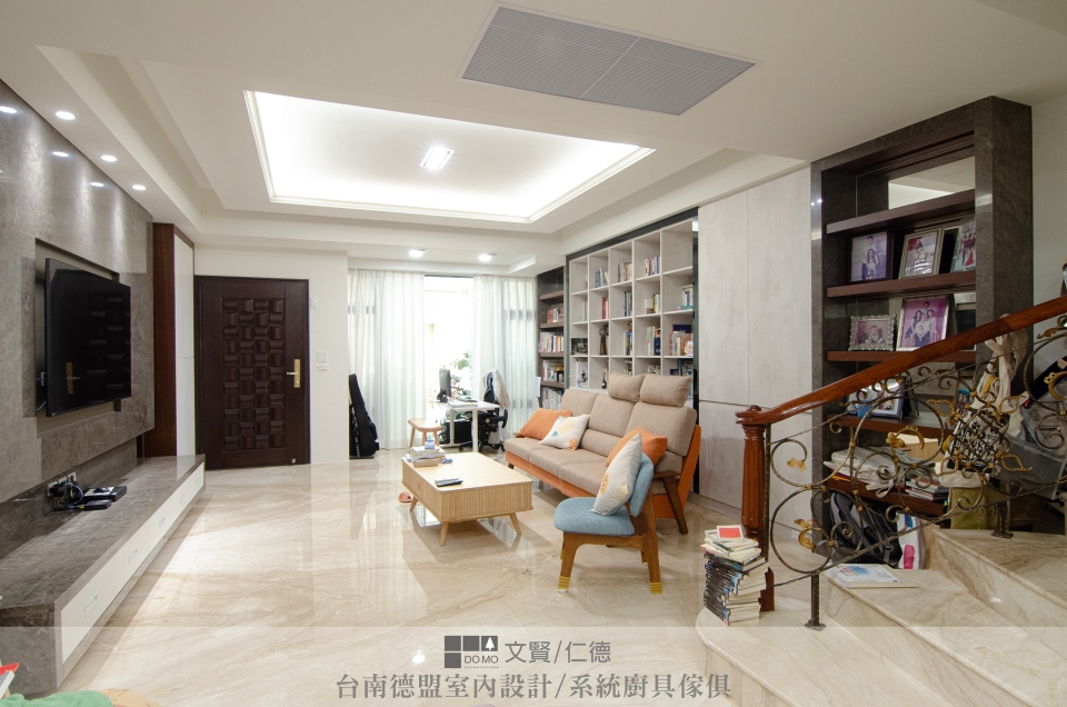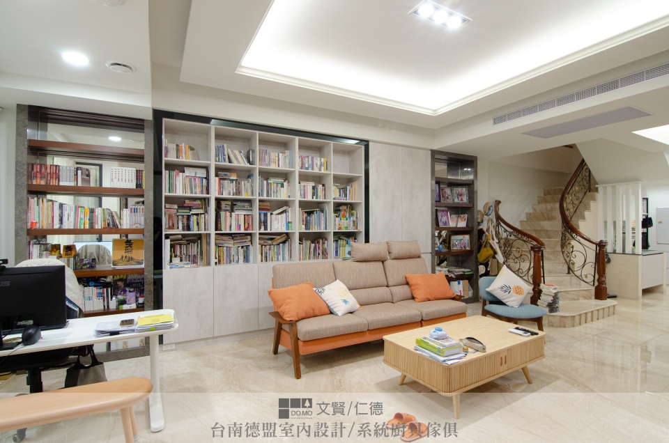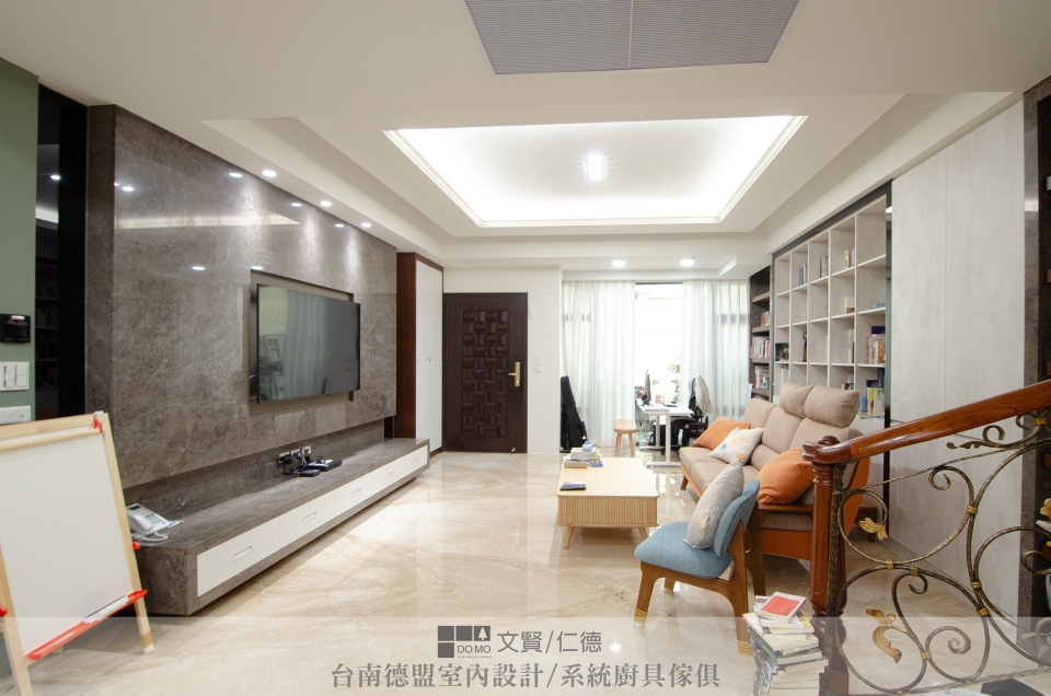 一樓的公領域面積大,不僅有客廳、餐廚功能,還規劃了書房功能。狀態十分良好且耐看的大理石電視牆完整保留,沙發後方的裝飾牆面全面改成書櫃,可完整收納業主的海量藏書。
