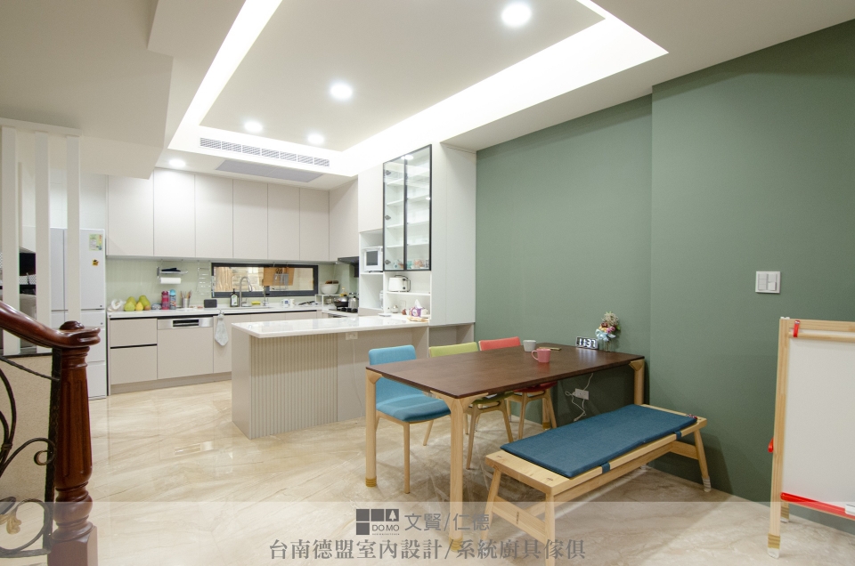 原本的餐廚區是搶眼的紅、白配色,規劃後改為羊絨灰,餐桌旁的壁面刷上低彩度的鼠尾草綠,整體營造輕柔又舒緩的氣息。