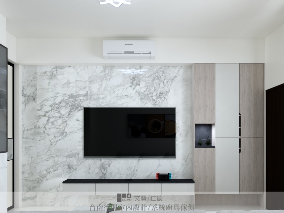 公領域運用大量的無機質的材料,不論是晶透盈白的灰色石紋可樂石電視牆,以及黑白石紋塑合板櫃體,均散發出冷冽卻質感十足的氛圍,設計師適當的融入局部溫潤暖色調的木紋作為入門右側的鞋櫃,巧妙的平衡空間中的「冷」。