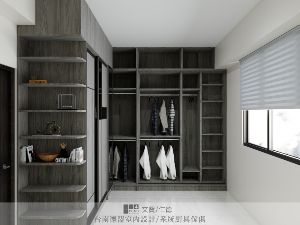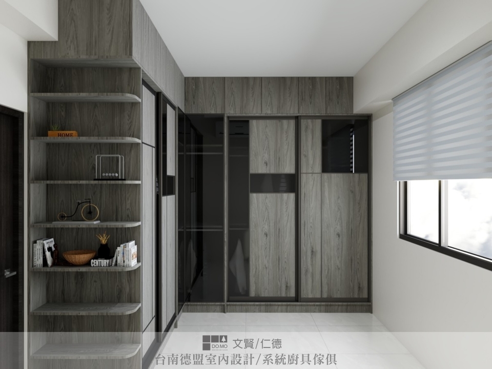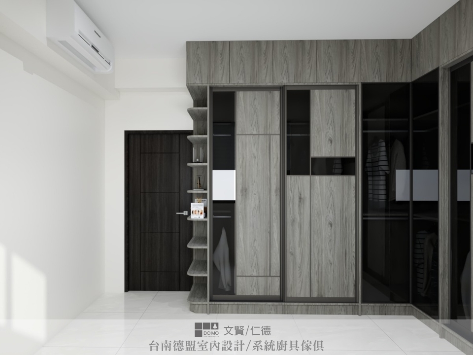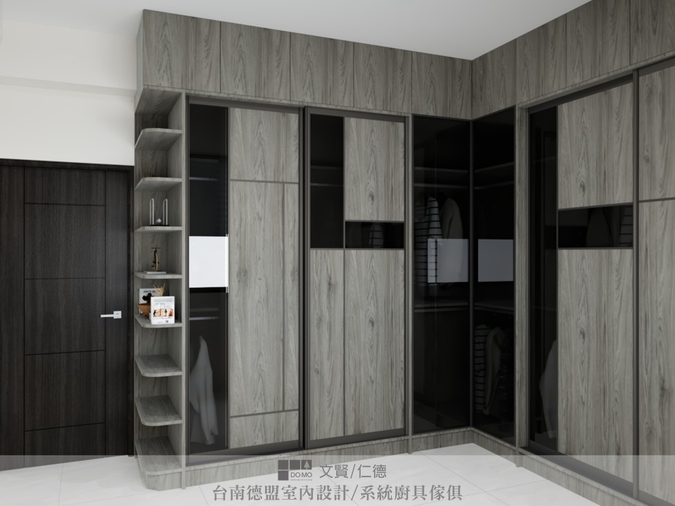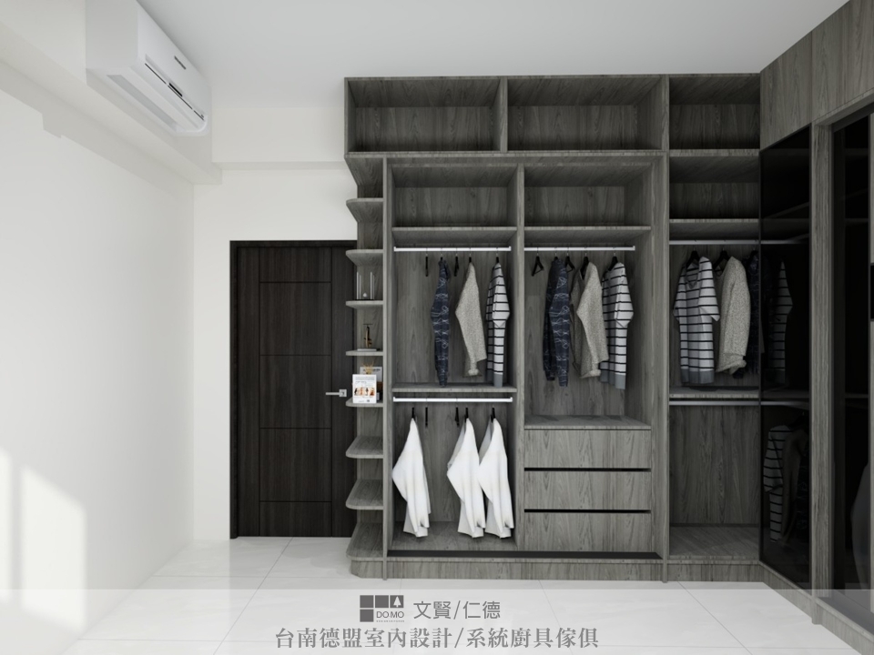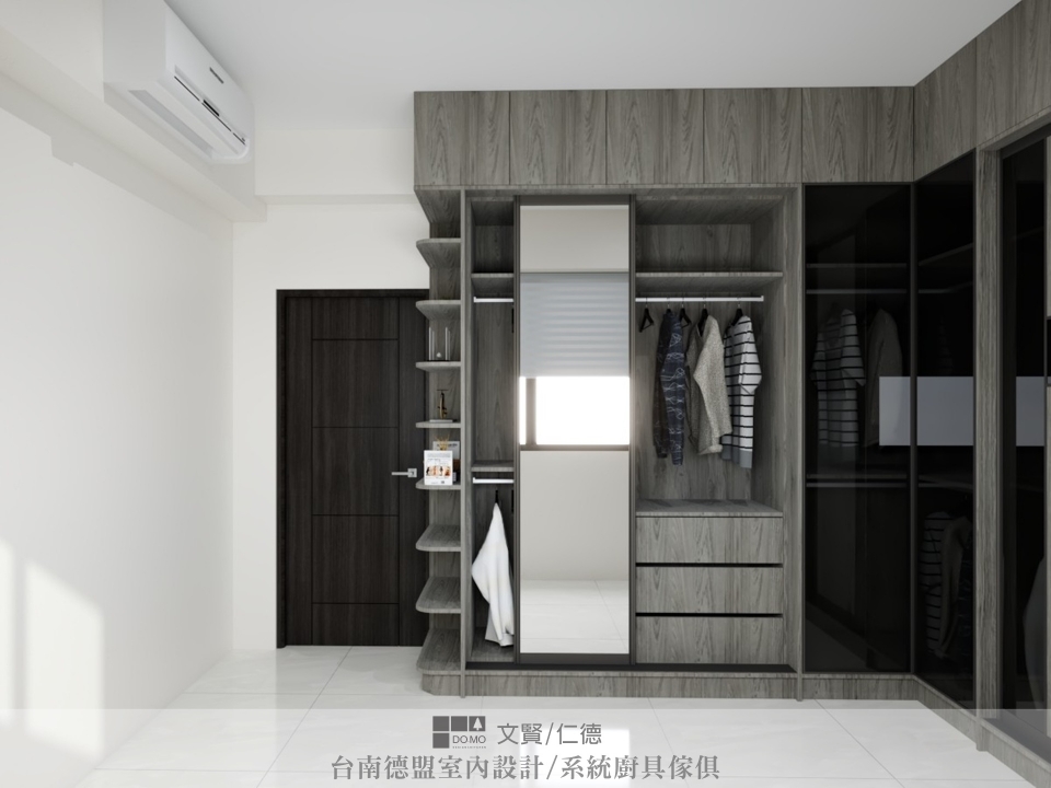 主臥室的L型衣櫃機能十足,足夠多的格層與吊衣桿能將業主的織物完美收納;選用的墨灰山胡桃木紋銜接客廳的冷冽質感,散發濃厚的獨屬於大人的成熟韻味。