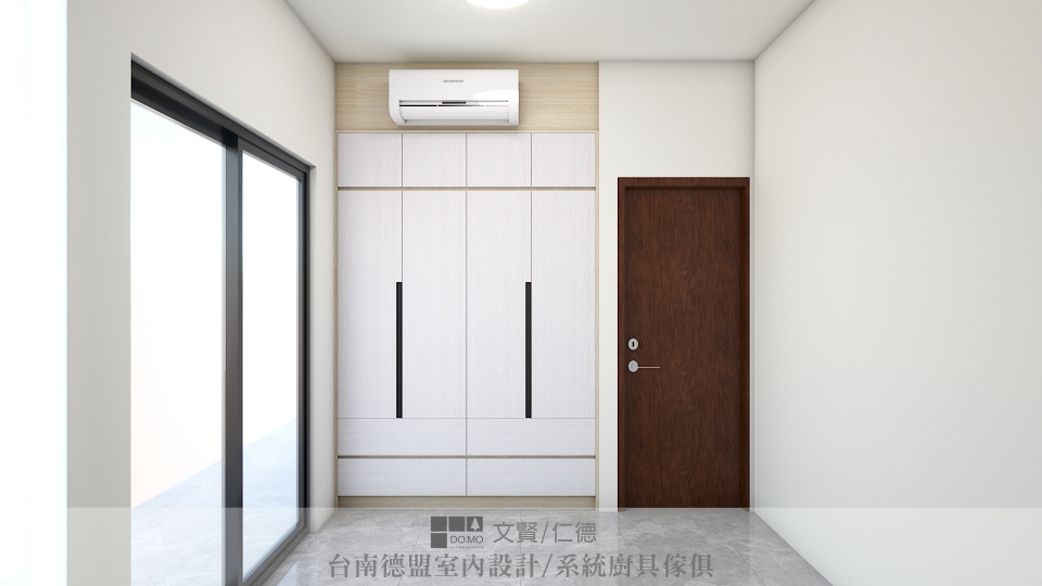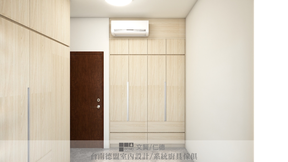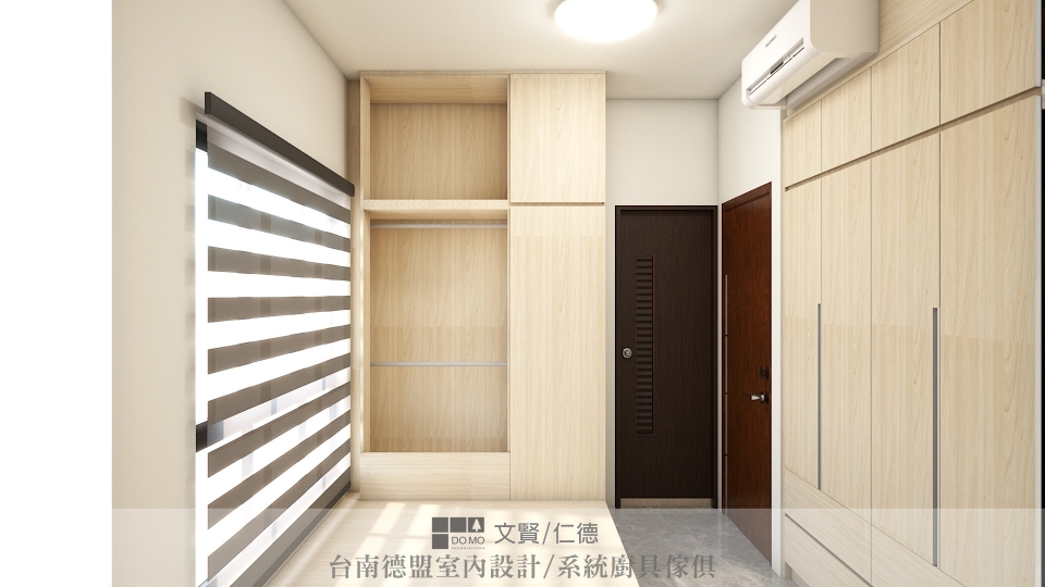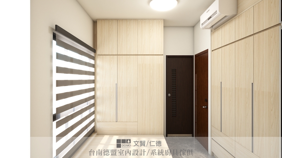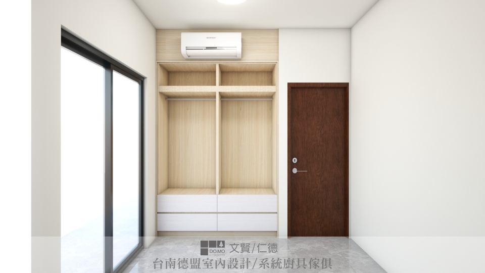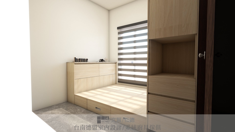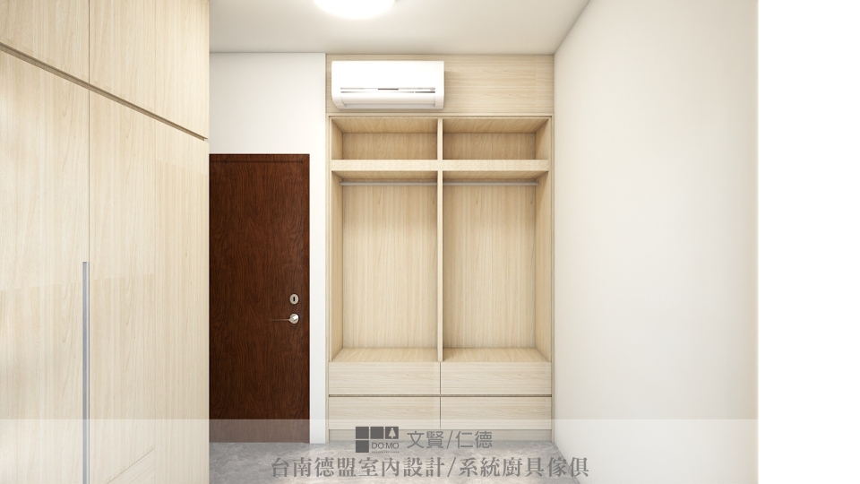 主臥與次臥則為了保留空間寬敞與簡潔,僅施作必要的衣櫃,並用系統櫃方式製作床架,底部抽屜延伸收納空間。