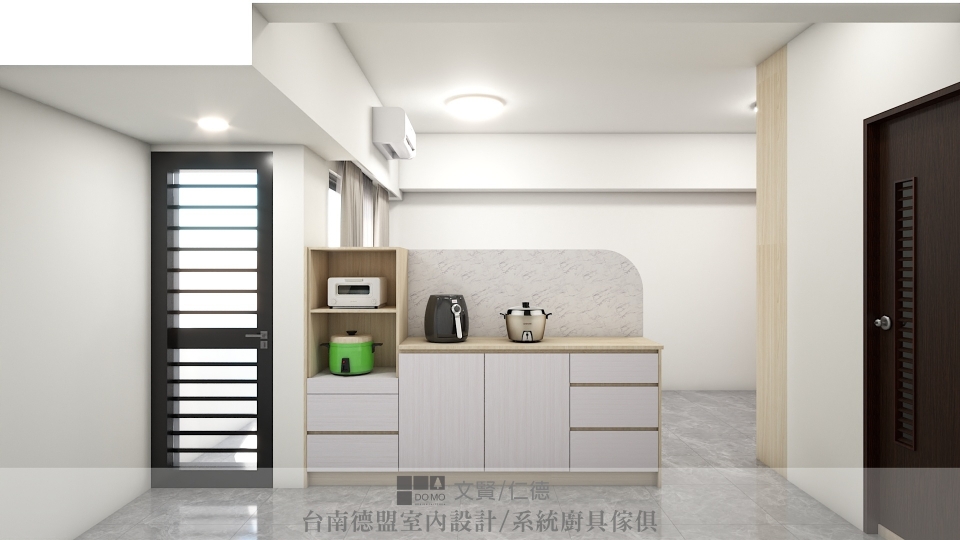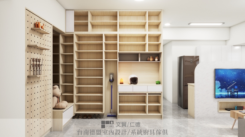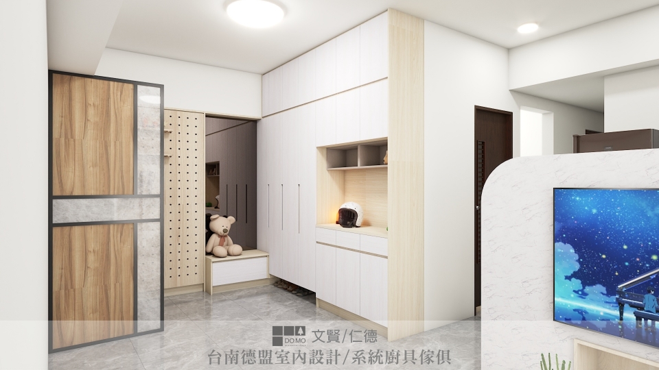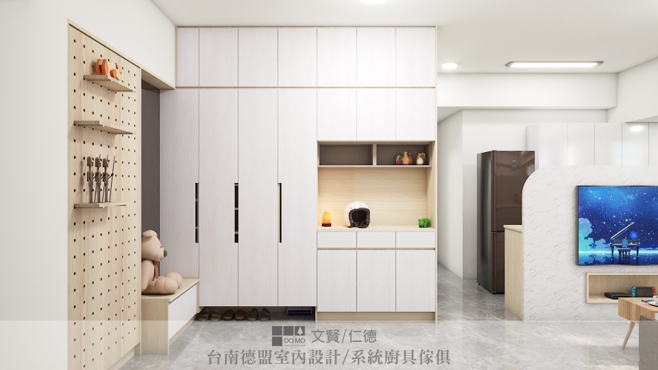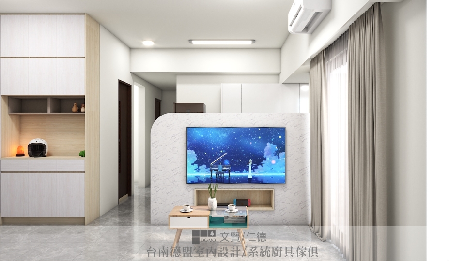 設計師在入門處設置隔屏,保留隱私也將出入所夾帶的塵土隔絕其外;廚房與客廳共處一區,礙於格局,沒有理想的牆面規劃為電視牆使用,因此設置一道半牆,將空間劃分為二,沒有做到天花板高度的半牆也保留空間的通透感,一面作為電視牆使用,一面則是輔助廚房收納用的電器櫃。