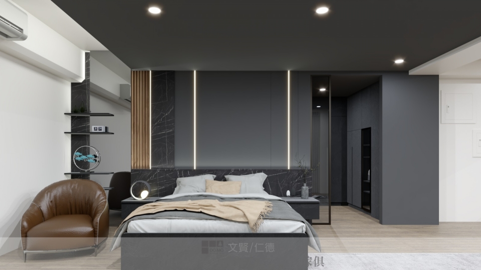 而私領域中,設計師為空間導入了輕量的木質感,降低黑灰大理石給予的冷硬肅穆感,為休憩的地方添加了一絲暖意。