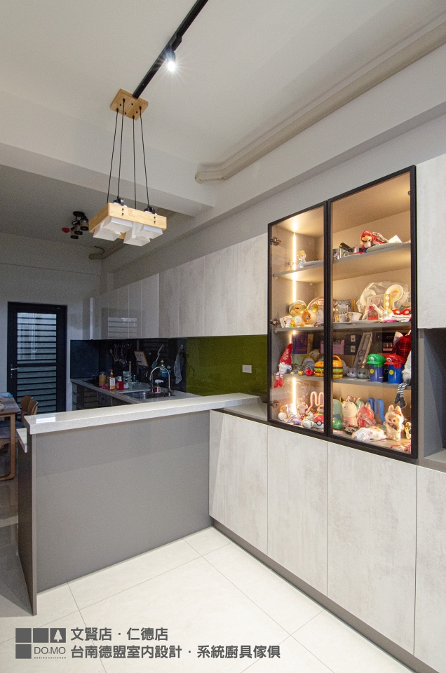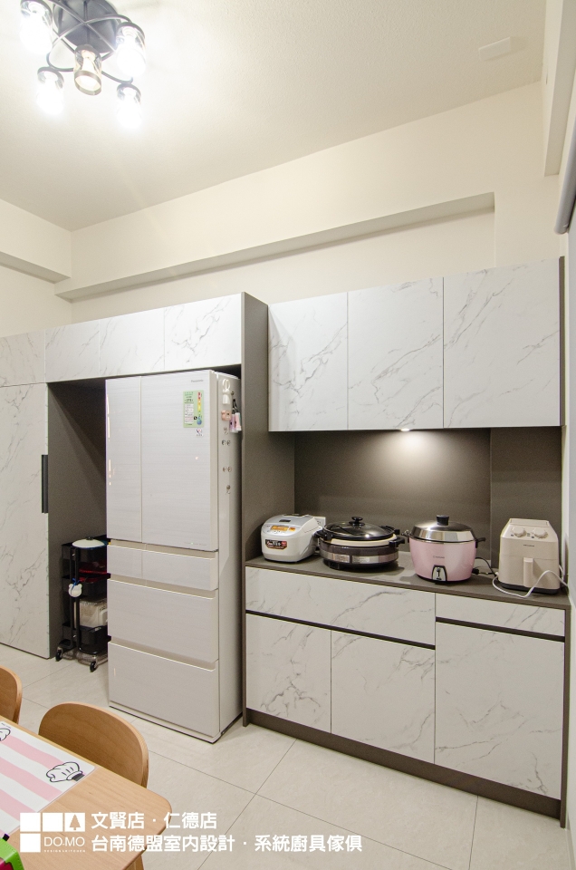 原本建商配置的是一字型廚具,但規格不符需求,因此向外延伸施作中島檯,方便使用者更彈性應用。