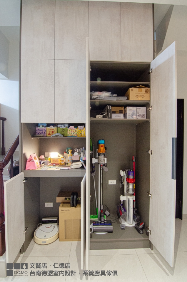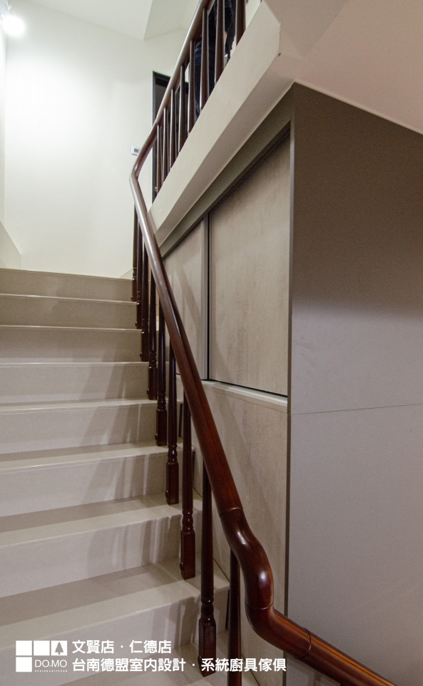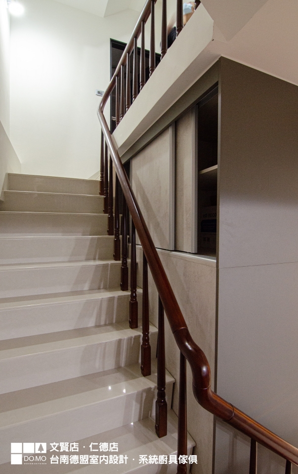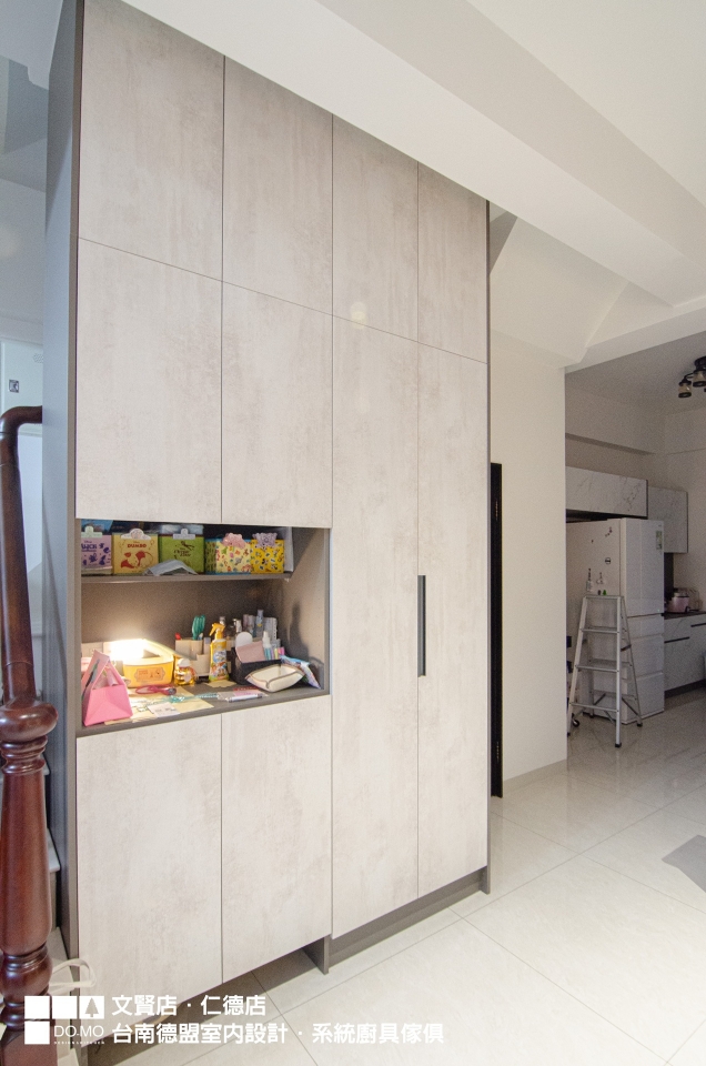 特別的是樓梯旁的高櫃,櫃子後方額外加了滑門,這麼一來置放於上方靠後的物品就可以從樓梯上輕鬆取用。