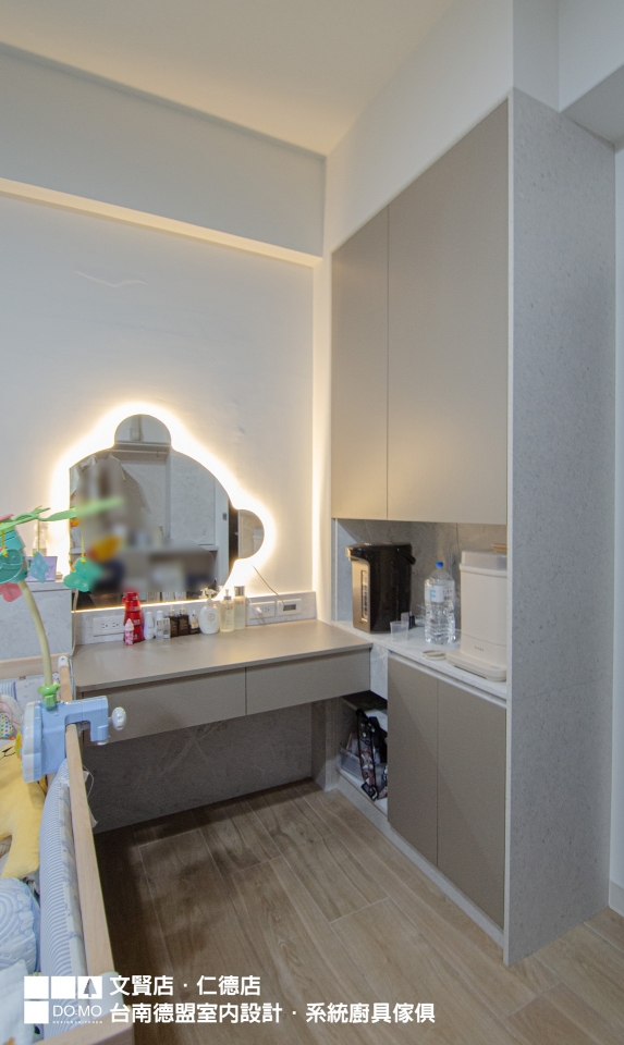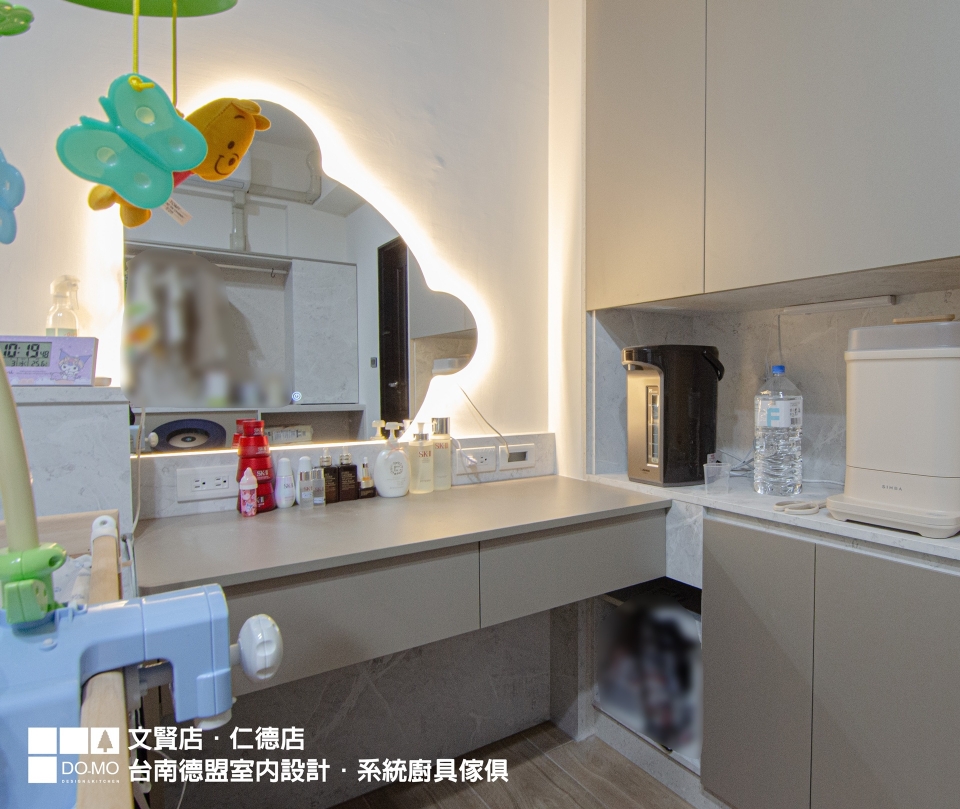 透天宅有寬敞充足的活動空間,但對於育有新生兒的家庭就稍有不便,如需沖泡奶粉、清洗奶瓶……等,還需至其他樓層的廚房。因此這一次設計師依照業主需求,在臥室的化妝桌旁規劃了半開放櫃,開放空間可放置熱水壺、消毒鍋等用品,未開放部分則做備品收納,方便業主就近完成寶寶的生理需求!
