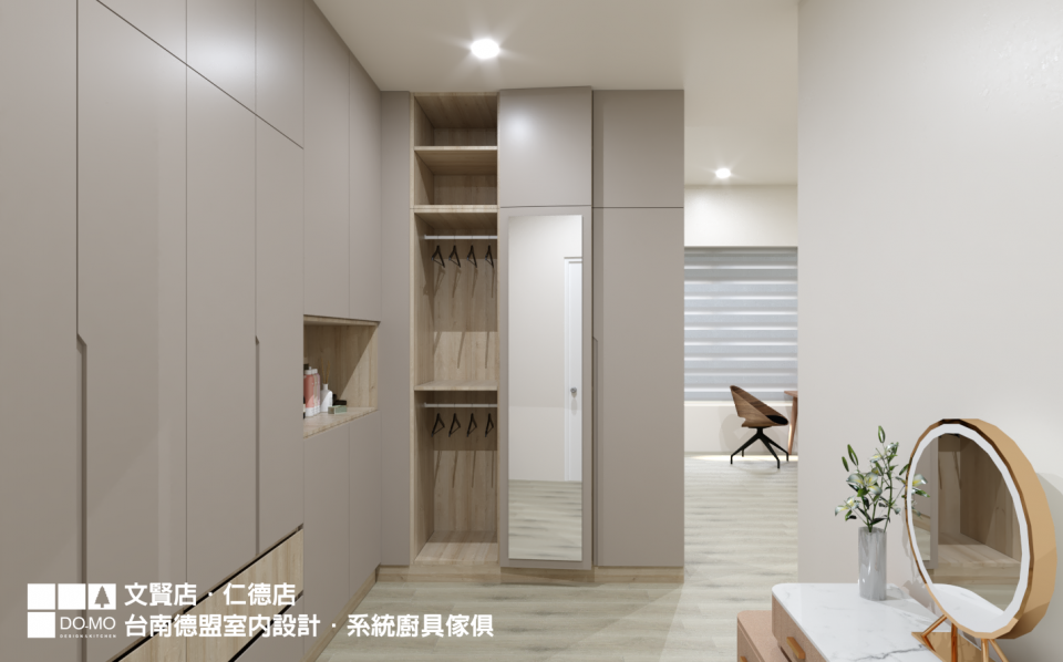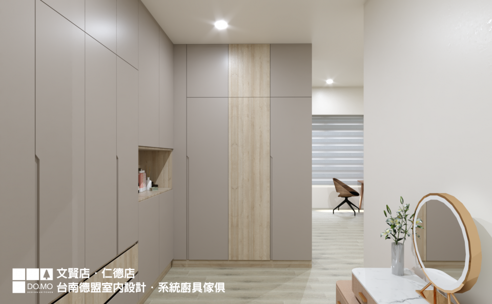 而空間裡的大面積收納櫃,選用不同色階的奶茶色與木作搭配,與木地板相互映,為整個物件帶出三分糖的溫馨甜味。